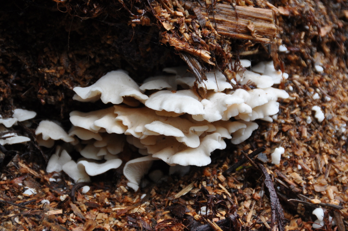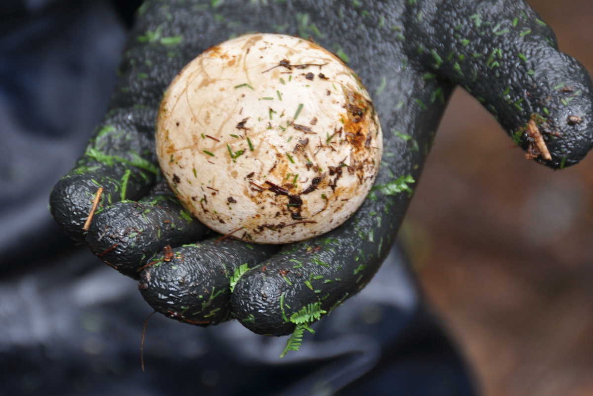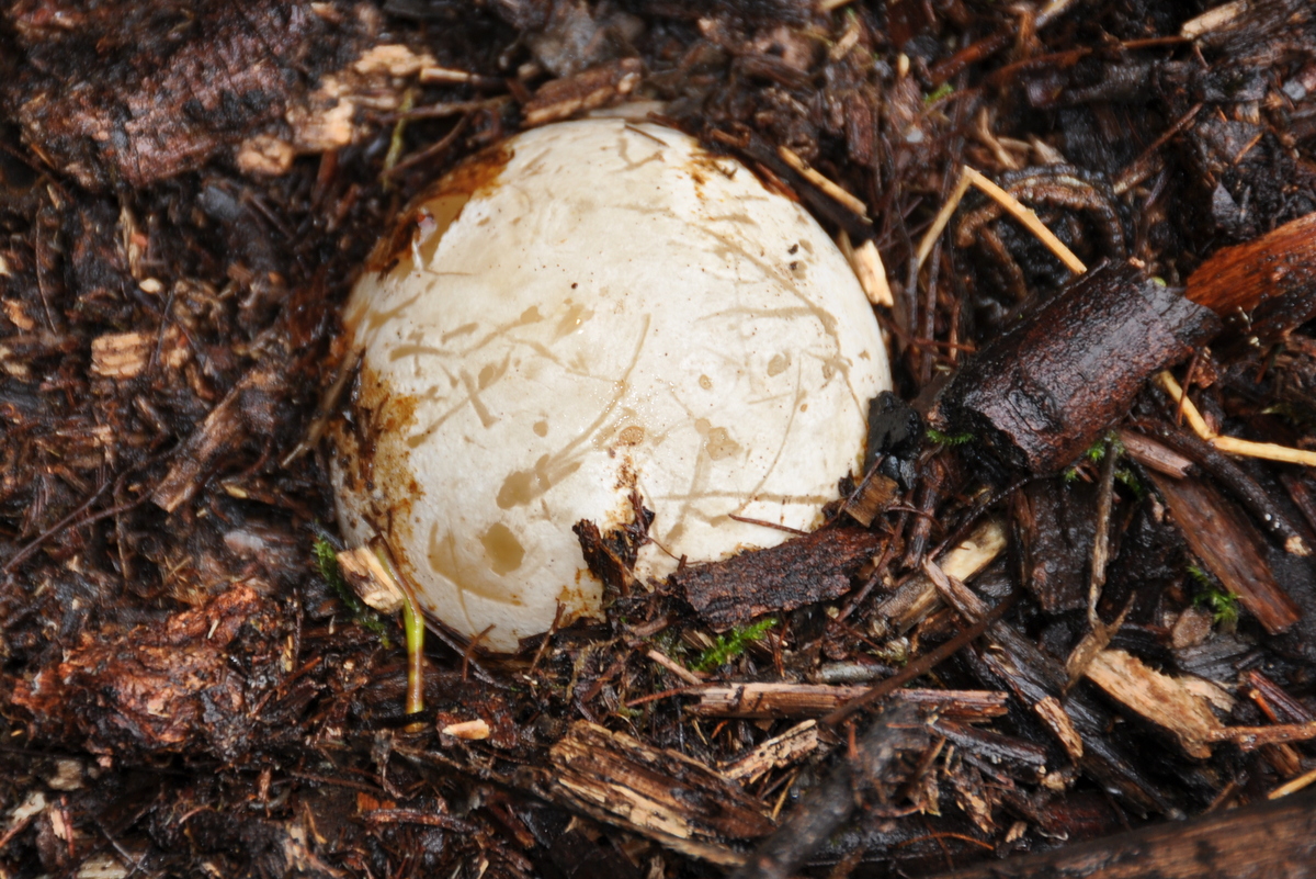 Quando todo o espaço disponível estava plantado, utilizou-se o recurso ali disponível, a ramada triturada, para fazer a cobertura do solo em torno de cada árvore plantada. Num dos montes observou-se um interessante fungo de cor branca, cumprindo a sua função decompositora. Aliás, esta parte final da manhã foi fértil na observação de plantas saprófitas: num dado momento, alguém anunciou com surpresa: “um ovo de dinossauro”! O exemplar estava semi-enterrado e tinha uma superfície vidrada e parecida com a de um ovo de casca fina. E era mole, logo não podia ser de dinossauro! Chamado o nosso biólogo de serviço, logo o espécime foi identificado como um cogumelo, mas um com um caule tão frágil, que não se podia erguer acima da superfície da terra. E de facto era tão frágil que, ao ser investigado mais em detalhe, logo se soltou do seu caule. Por dentro, tinha uma camada grossa de uma consistência gelatinosa, mas ao que parece, não comestível. É fascinante como uma paisagem que sofreu um processo de degradação tão intenso, ainda (ou já!) nos pode surpreender com coisas que nunca tínhamos tido a oportunidade de encontrar por aqui!