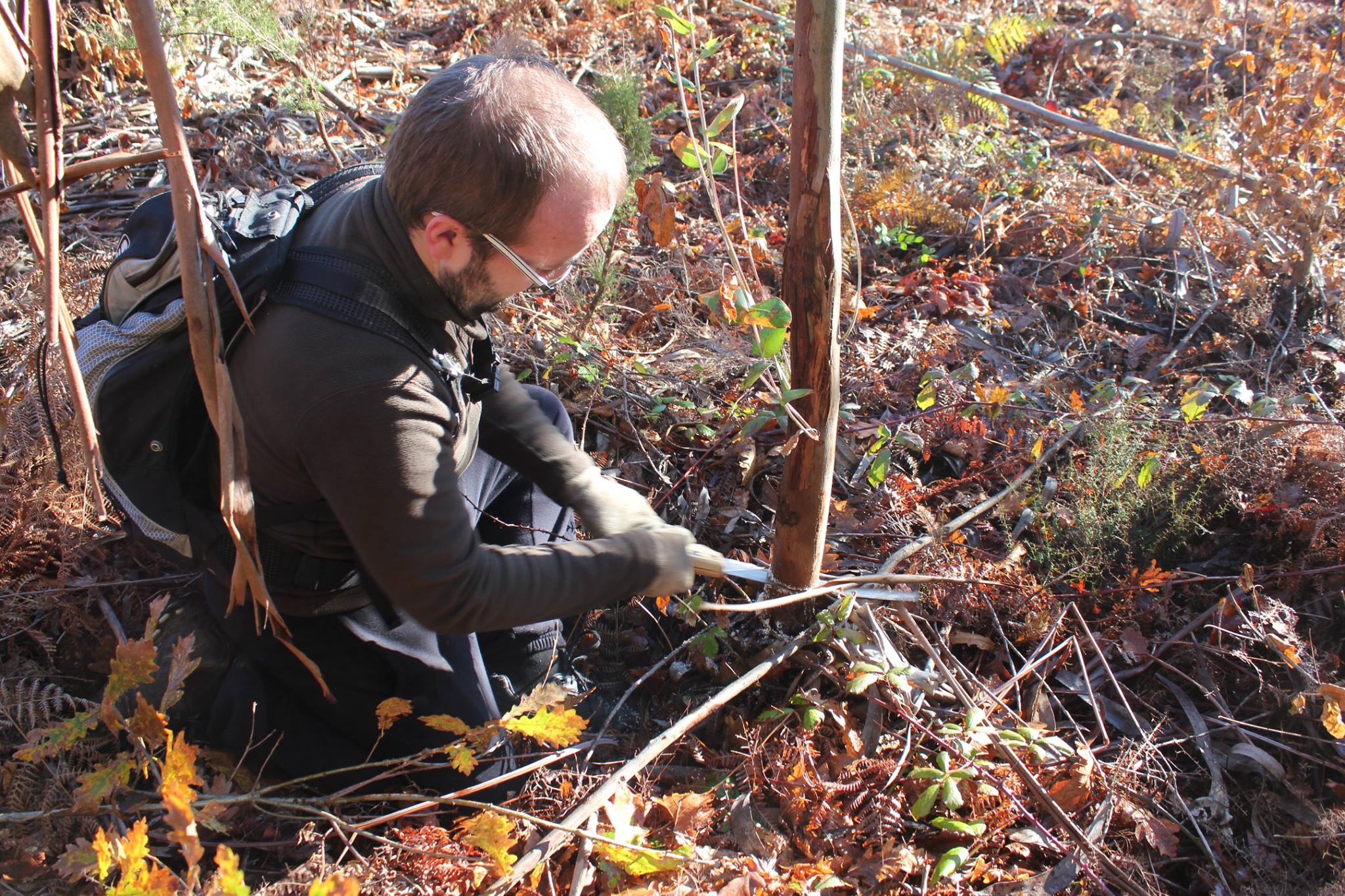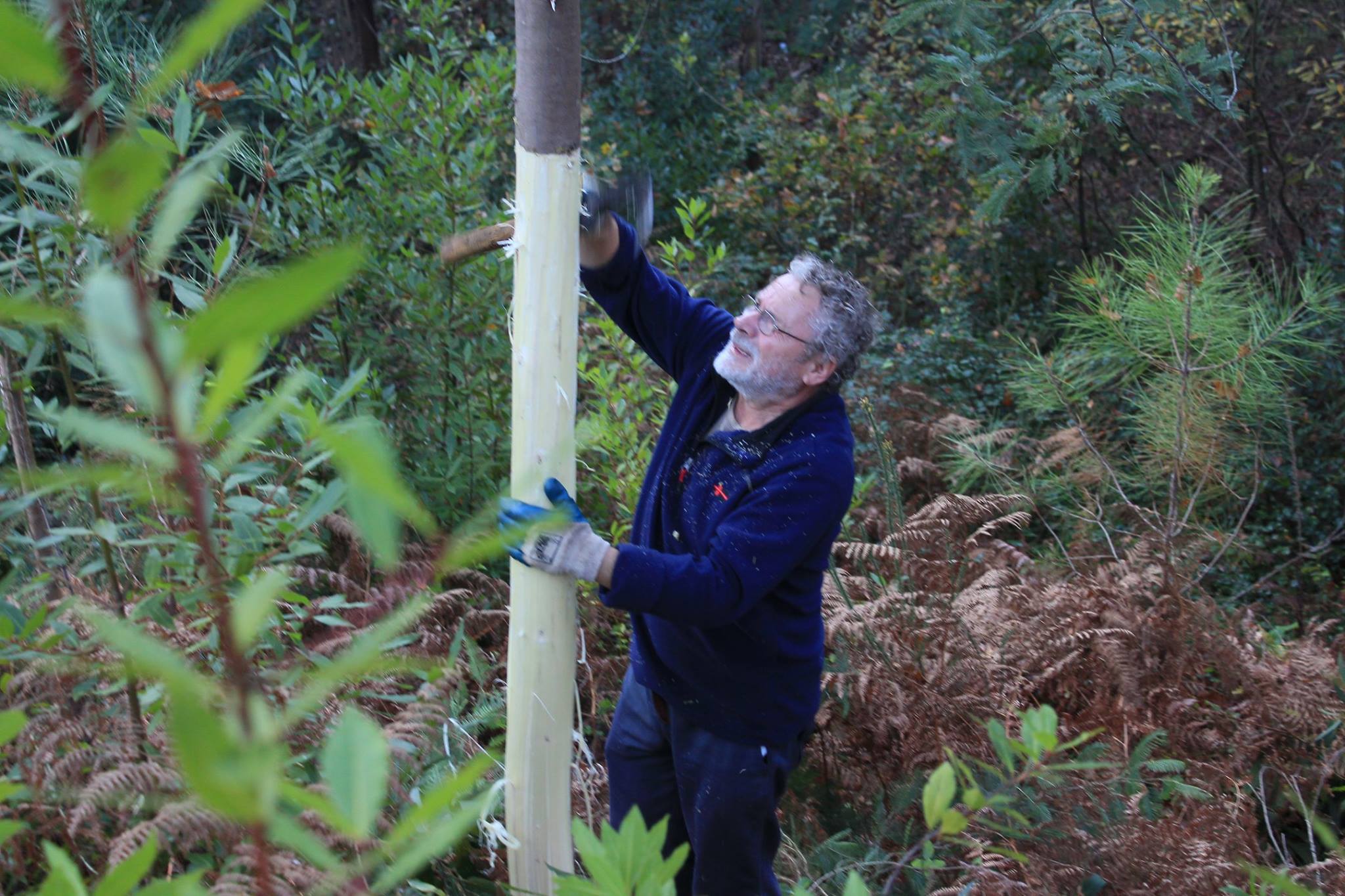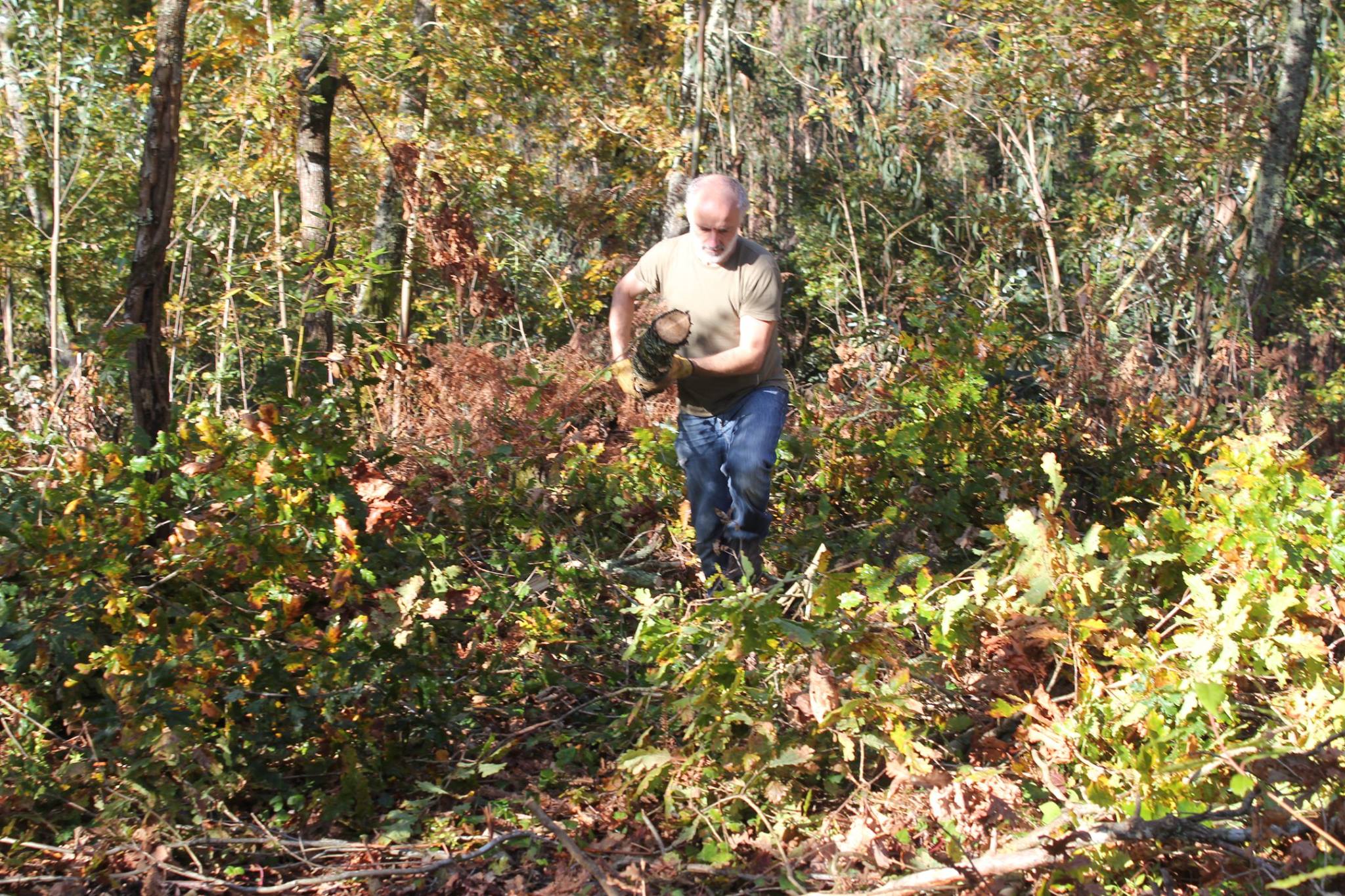 Mas voltemos a este Sábado. O objectivo da jornada era iniciar a recuperação de uma pequena mancha de carvalhal situada entre o vale nº 2 e o Ribeiro, logo a seguir à povoação do Feridouro. Esta é uma área nova acrescentada este ano à área de intervenção do projecto, e que tinha um eucaliptal cortado também este ano. A presença dos carvalhos deve-se em parte à existência de uma linha de média tensão que, obrigando à remoção dos eucaliptos, acabou por criar espaço para que outras árvores pudessem “florescer”. Mas, sobretudo junto ao vale nº 2, é provável que já existissem carvalhos mesmo antes da “era” do eucalipto. Os carvalhos que sobreviveram à queda dos eucaliptos, ficaram contudo bastante danificados, outros ainda tinham “feridas” do incêndio de 2005 e finalmente outros foram cortados pela base, tendo entretanto rebentado de toiça. Os rebentos de eucalipto já tinham, por seu lado, sido eliminados por pulverização com herbicida. Mas também havia locais em que a densidade dos carvalhos era excessiva, outros em que ainda tinham ficado em pé eucaliptos demasiado finos para valerem o trabalho de serem cortados.