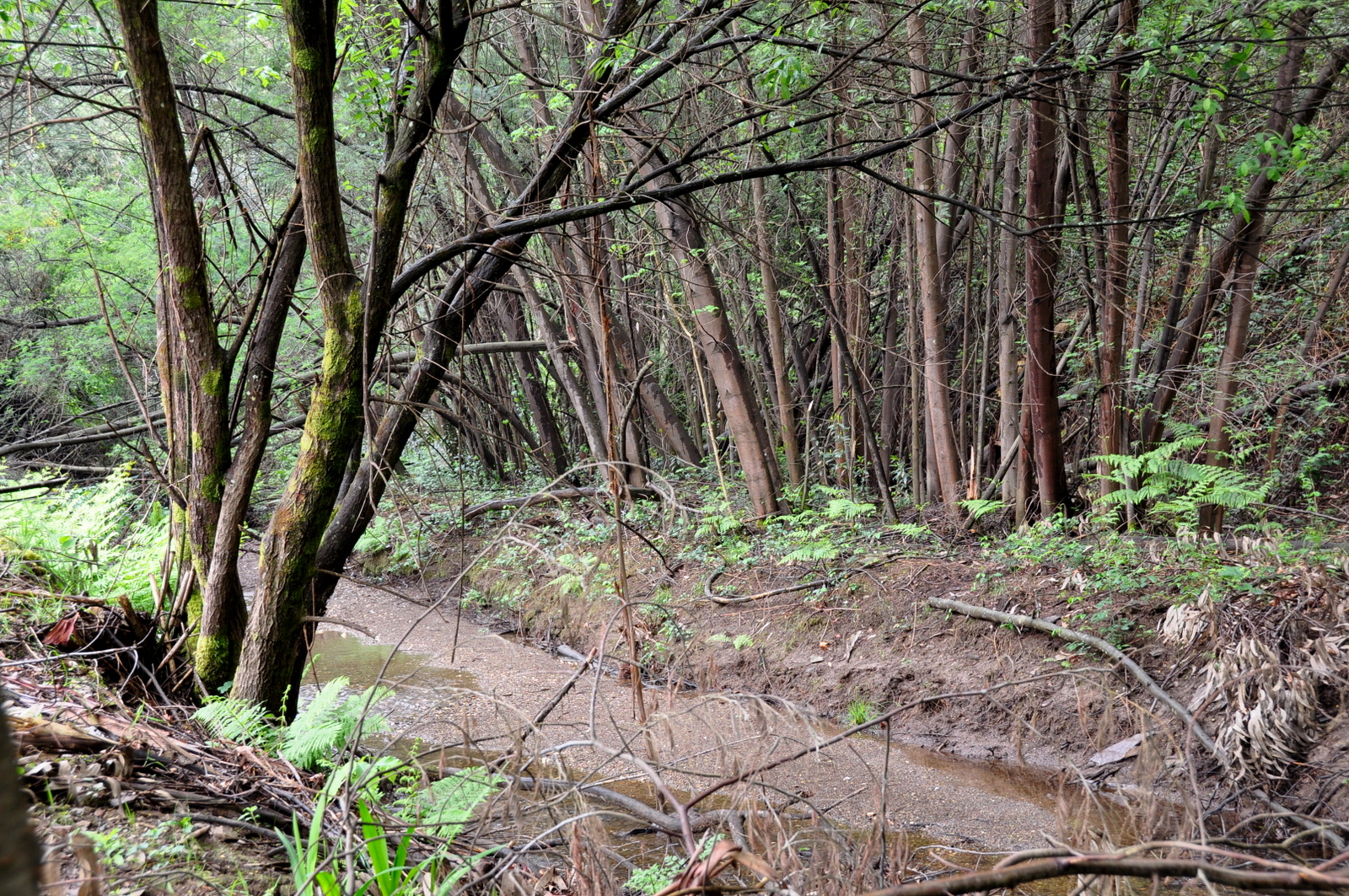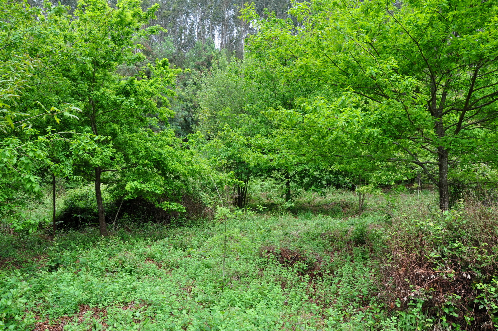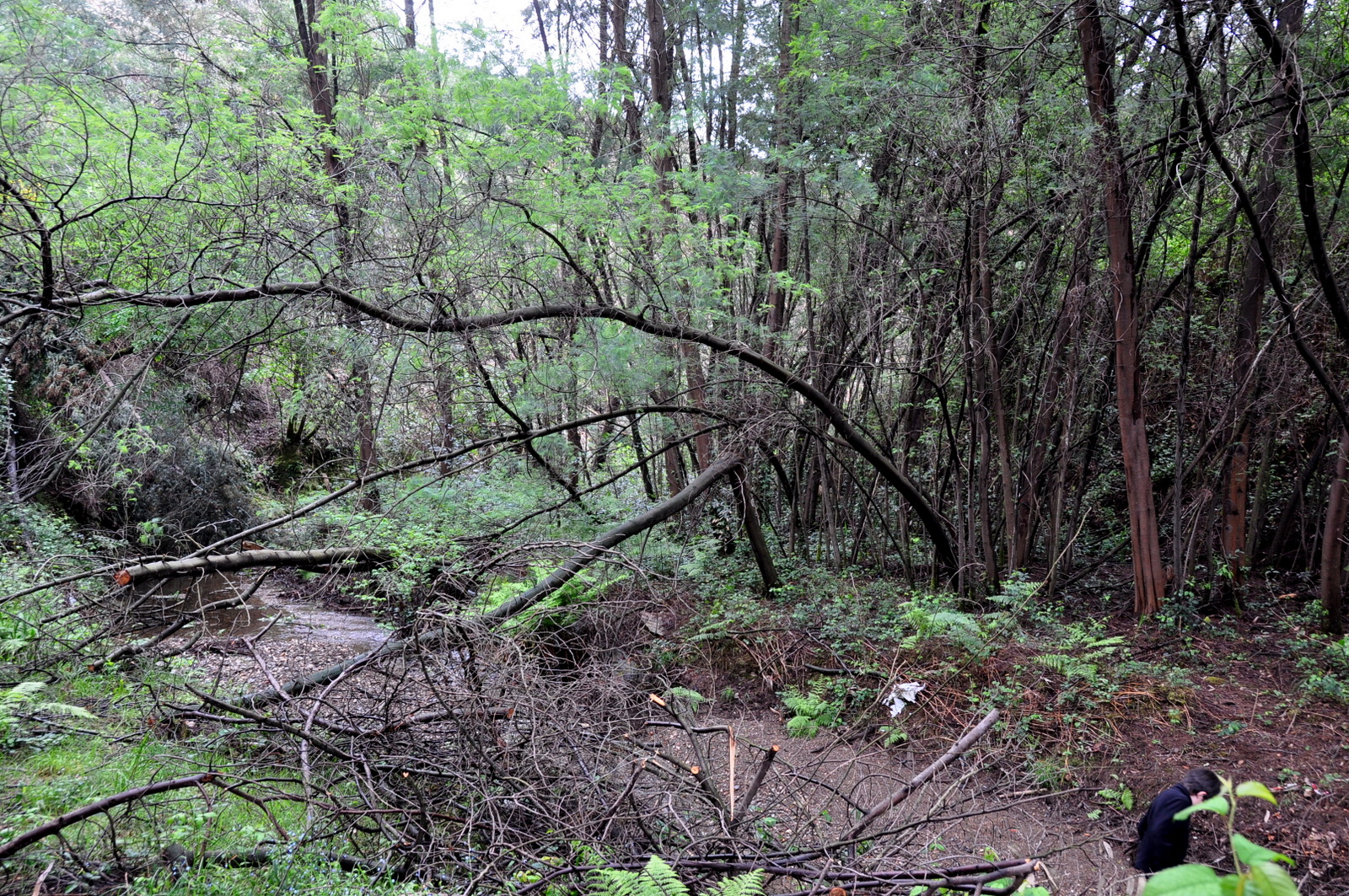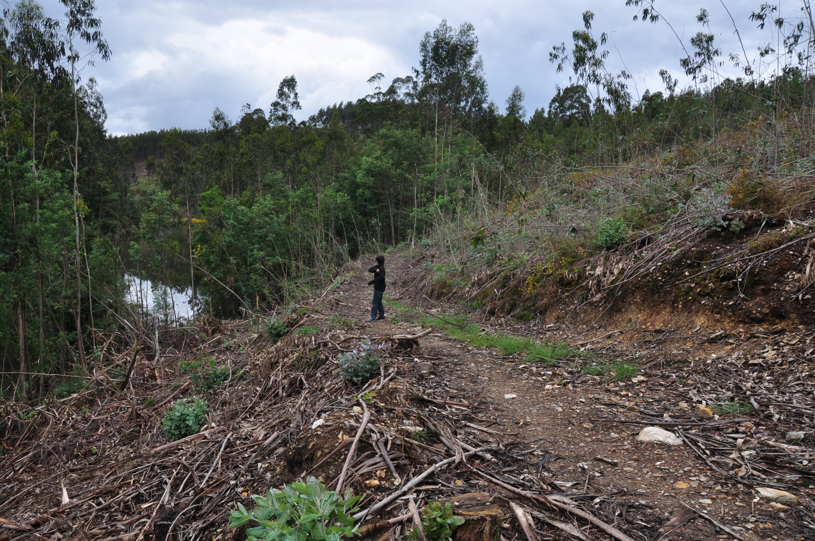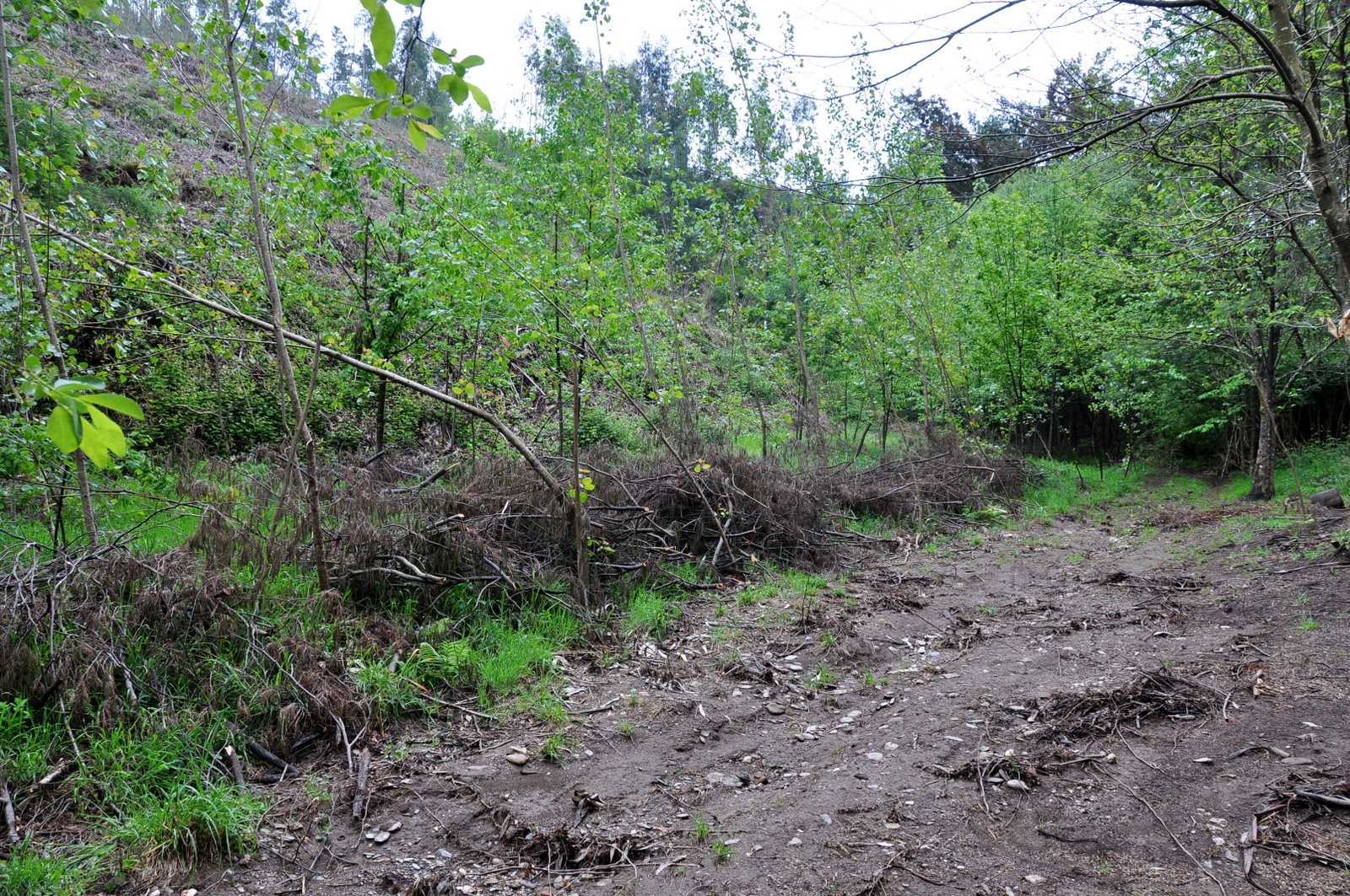 O trabalho, esse, foi sobretudo de corte de mimosas, partindo da mancha de carvalhal, onde já tínhamos trabalhado, em direcção ao vale nº 6, já na propriedade da Altri Florestal. Aqui o solo é muito mais pobre do que ali uns metros ao lado, condição agravada por uma mobilização de solo antiga para plantação do eucaliptal, que, muitos anos depois, ainda se revela, por vezes com crateras profundas no terreno pedregoso. Esta foi uma das primeiras áreas de reconversão de eucaliptal na mata da Altri Florestal, iniciada ainda em 2008. Em 2009 e 10 foram plantados medronheiros nas áreas mais pobres e carvalhos em torno do vale, mas também foi aqui que as mimosas mais aguerridamente se mantiveram, beneficiando do acesso difícil e das condições de humidade. Contudo, aproveitando uma antiga levada de rega que aqui havia, a equipa de voluntários foi progredindo em direcção ao vale, finalmente conseguindo lá chegar já pelo final da manhã, na zona da sua “foz” no ribeiro.