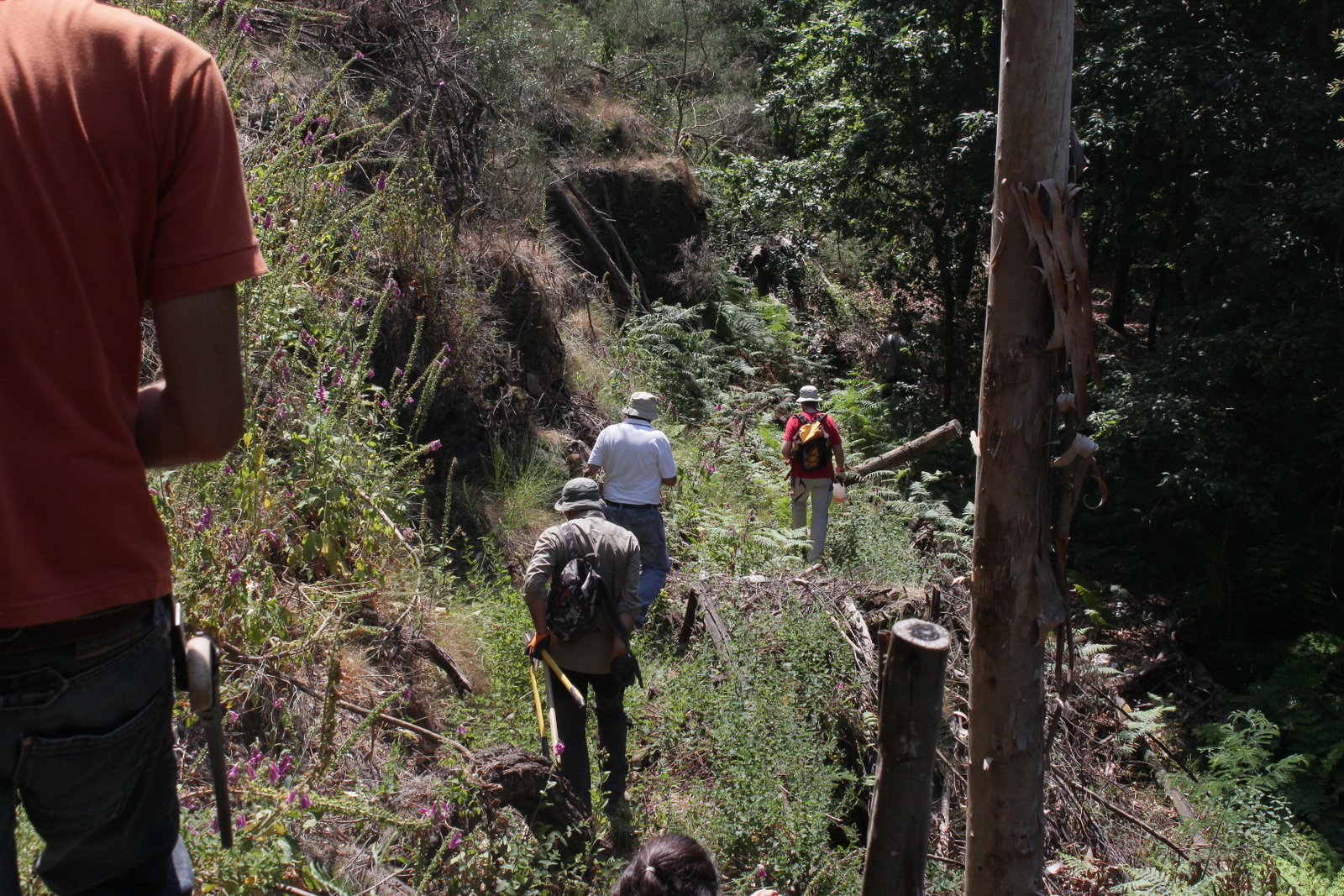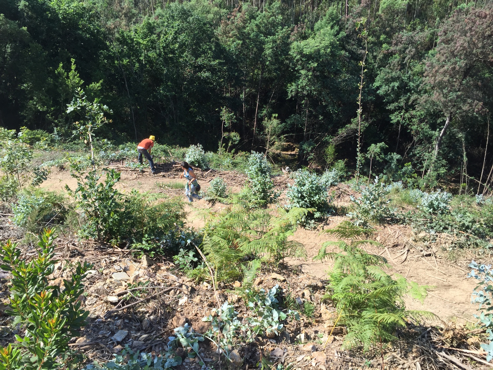 Depois, já a manhã ia adiantada, a equipa deslocou-se uns 800 metros para montante, a fim de realizar trabalhos de acompanhamento numa das primeiras áreas ribeirinhas a ser intervencionada pelo projecto, já nos idos 2008. Trata-se de uma encosta estreita e muito inclinada já dentro da mata da Altri florestal. Estes trabalhos são sobretudo de corte das mimosas que por aqui foram resistindo… Mas em contrapartida já há muitas nativas, e mesmo os mais ornamentais ciprestes-do-Buçaco. Entretanto fez-se algum trabalho de motoroçadora na área junto à ponte do PR8 sobre o ribeiro.