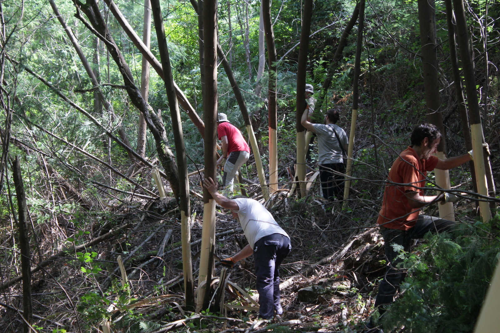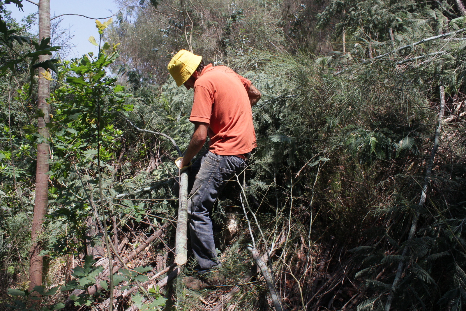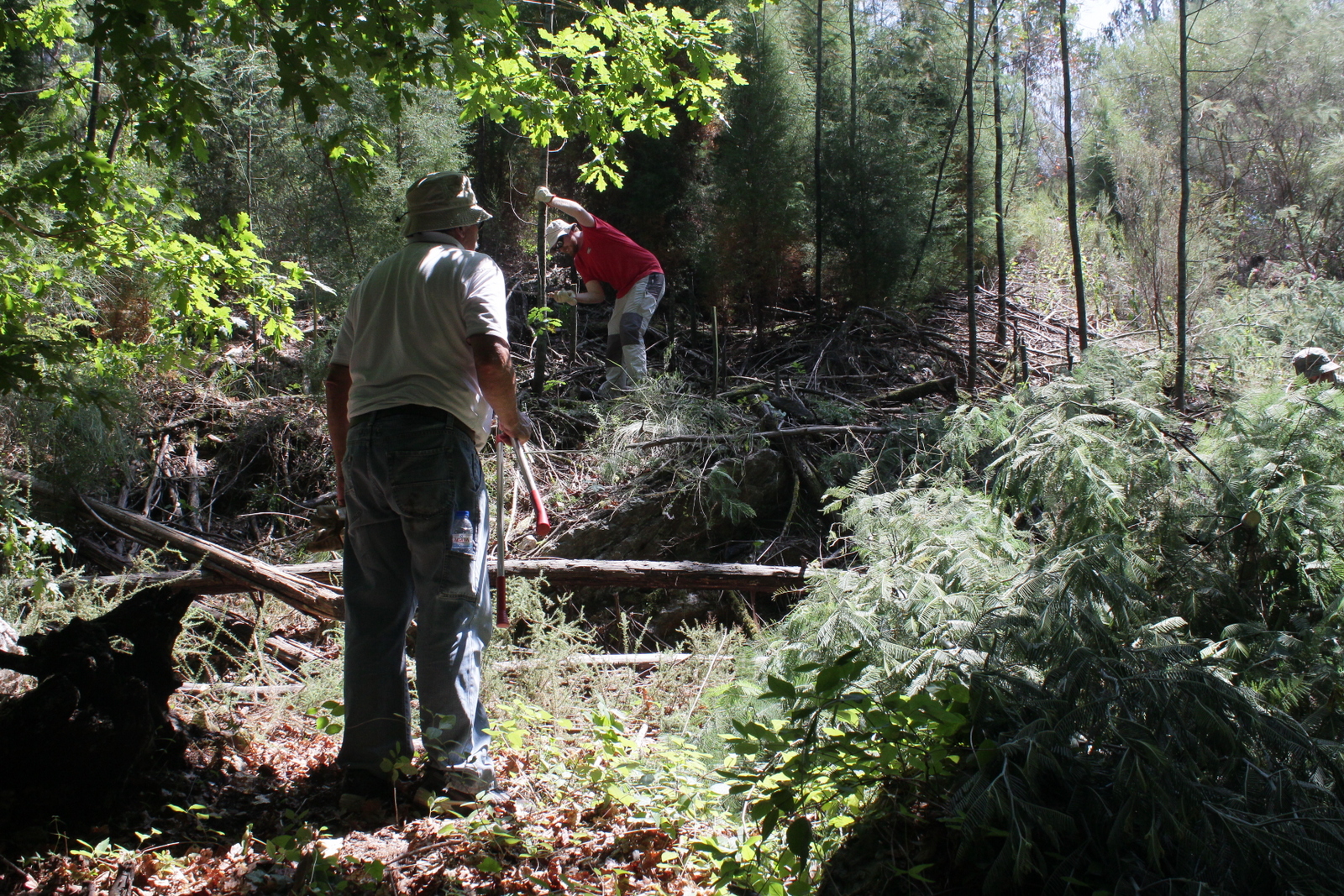 O dia já aquecia bastante quando se fez uma pausa para o almoço e até a pobre sombra dos eucaliptos foi apreciada. Depois do almoço fez-se trabalho à sombra e bem perto da água, para parecer mais fresco: descascaram-se mimosas na margem sul do ribeiro, ainda na mesma área.