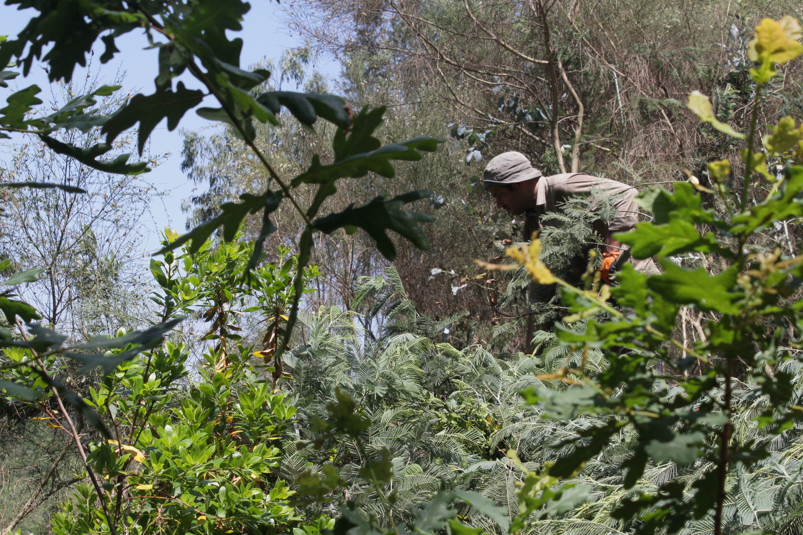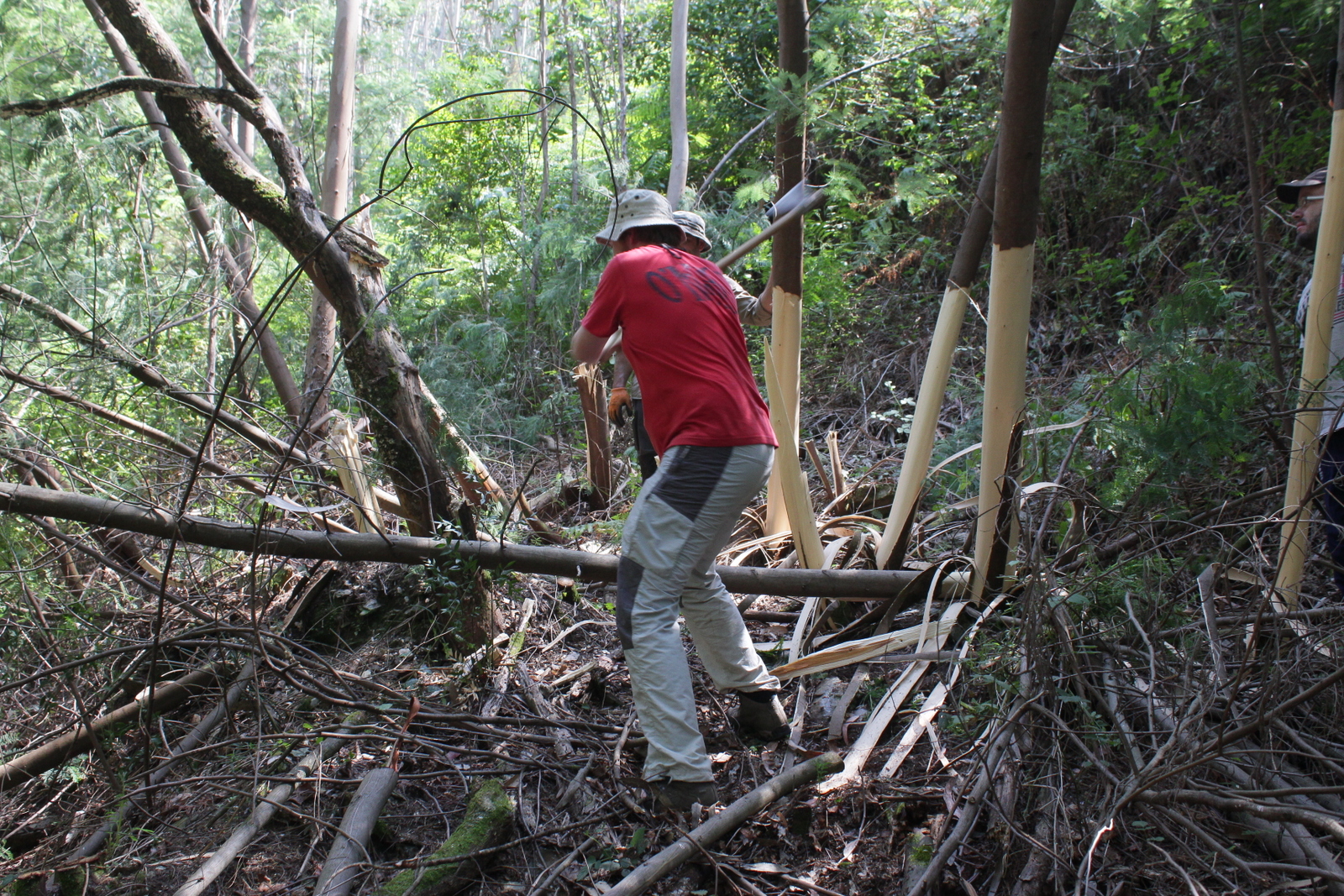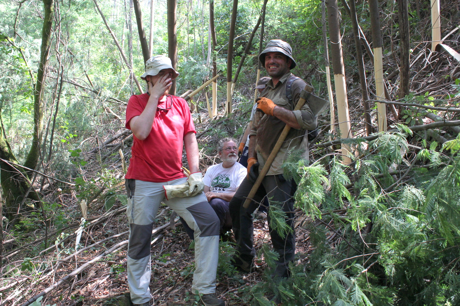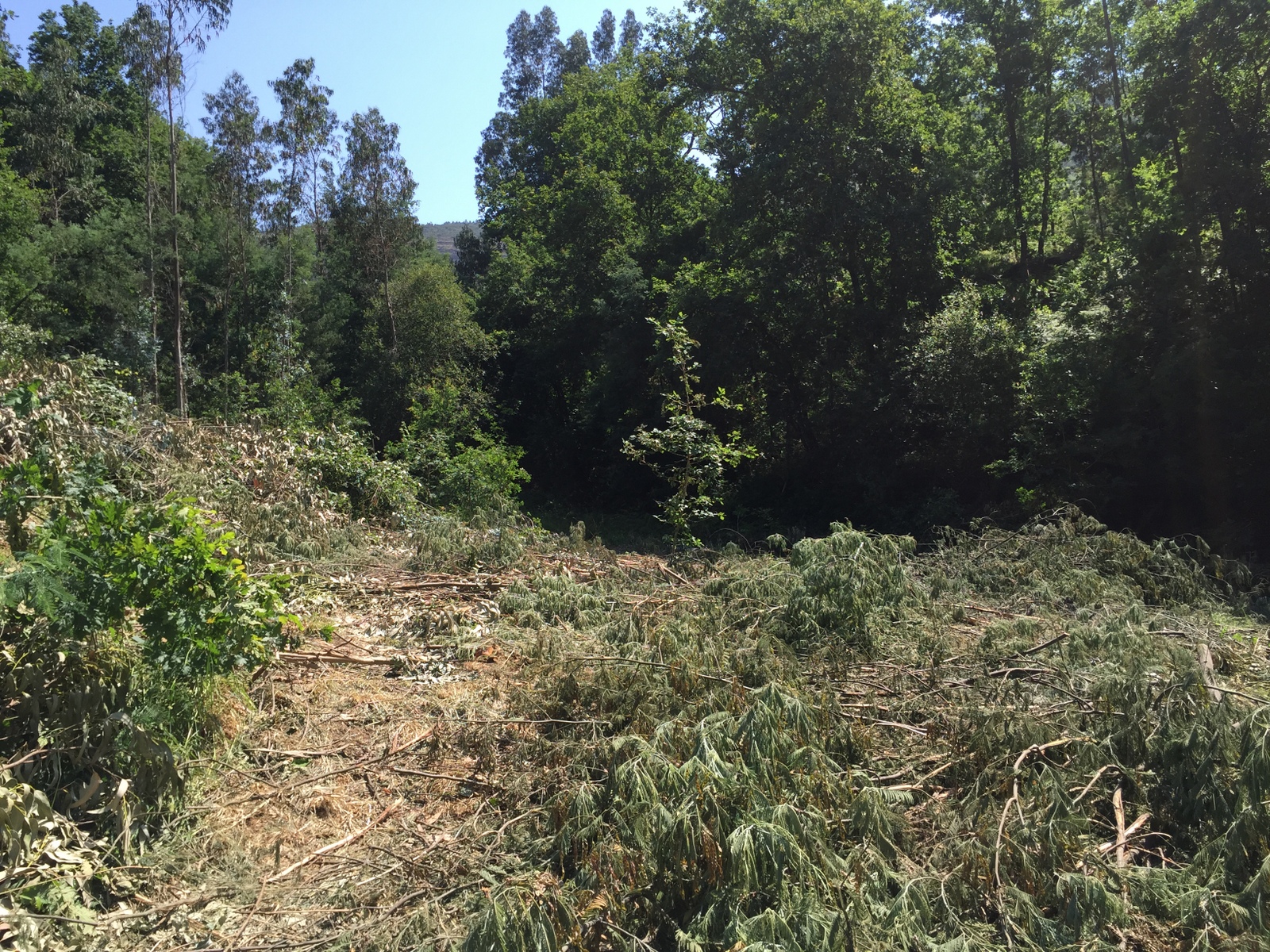 O dia já aquecia bastante quando se fez uma pausa para o almoço e até a pobre sombra dos eucaliptos foi apreciada. Depois do almoço fez-se trabalho à sombra e bem perto da água, para parecer mais fresco: descascaram-se mimosas na margem sul do ribeiro, ainda na mesma área.