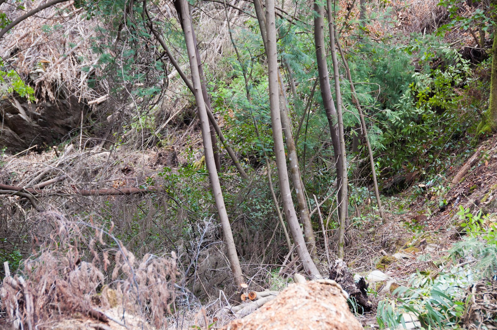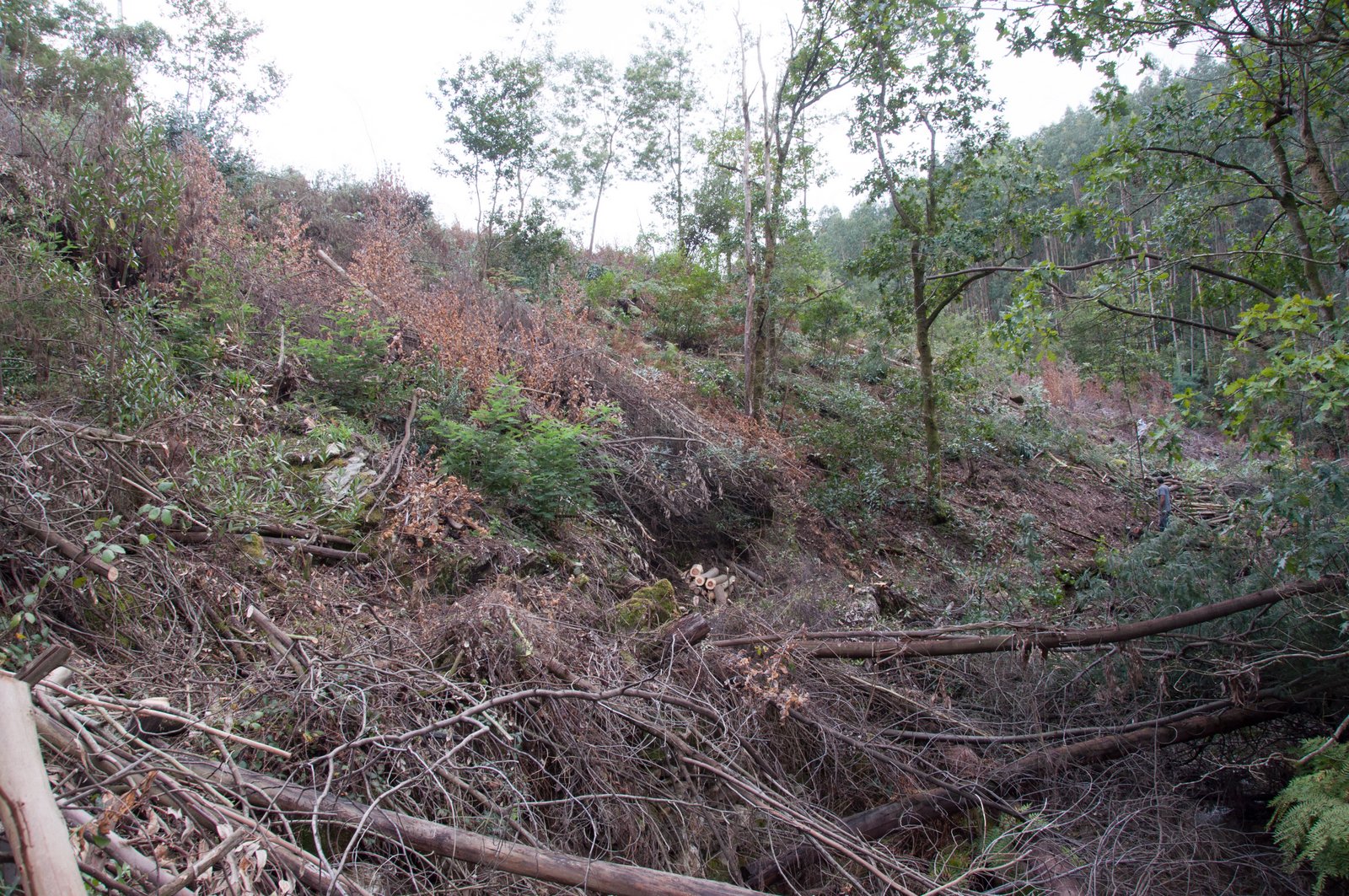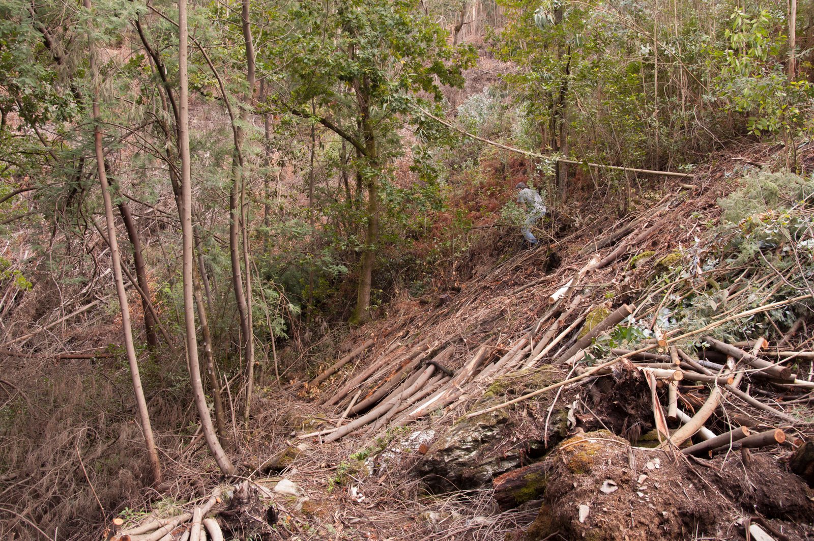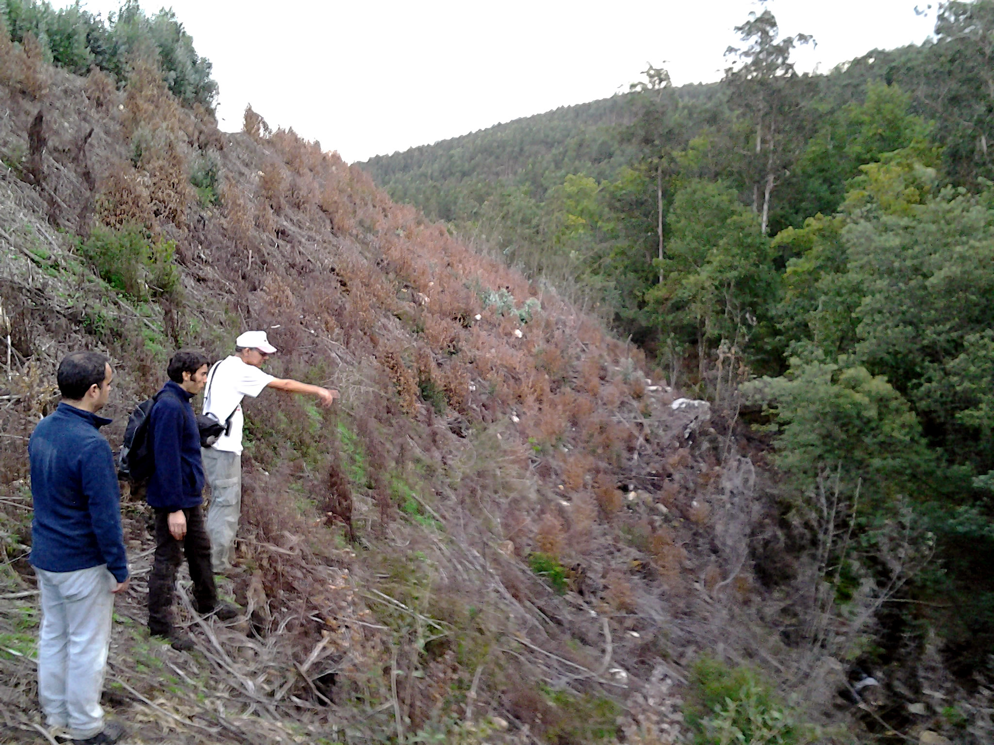 Curiosamente, apesar da densidade de eucaliptos e mimosas que ocuparam este local nos últimos 10 anos (quer de uns, quer de outras, densidade muito aumentada pela germinação do banco de sementes a seguir ao fogo de 2005), também se encontravam por aqui algumas árvores e arbustos nativos, que, depois de 10 anos de intensa competição, finalmente se vêm livres de tão agressiva e inconveniente companhia: identificámos pelo menos alguns carvalhos, adernos e loureiros, estes até relativamente abundantes, desde as margens do ribeiro até às cotas mais elevadas da encosta.