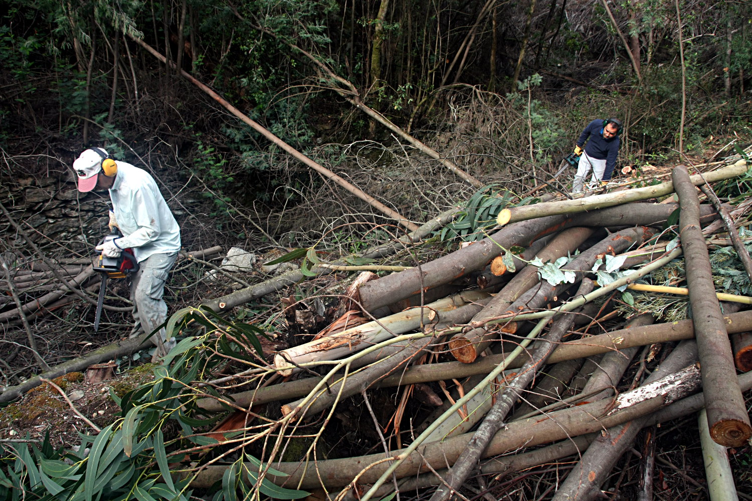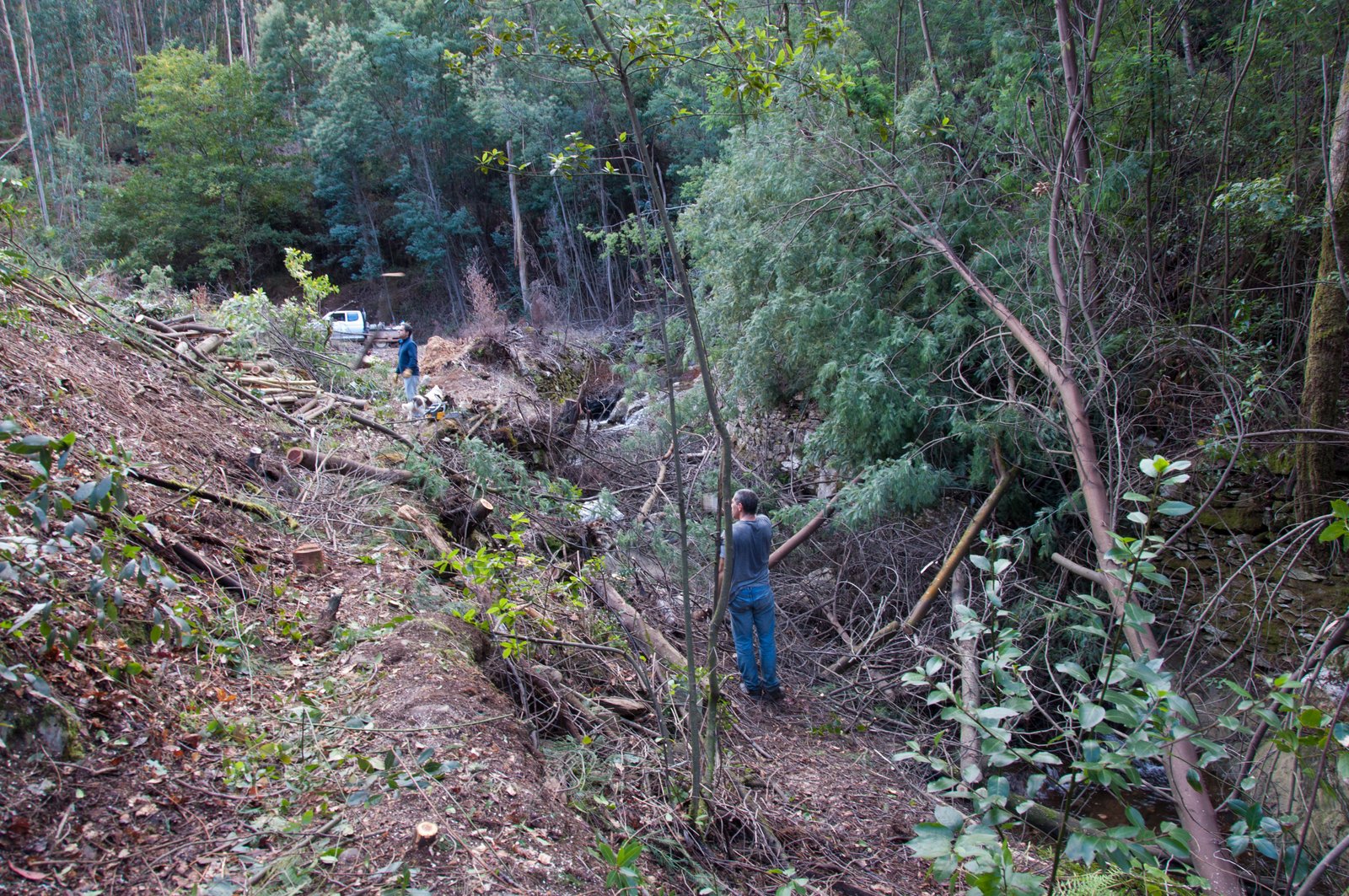 As primeiras fotos tiraram-se a meio da manhã, já os trabalhos iam avançados na encosta. Aí só ficaram algumas mimosas em pé, que se preferiu descascar, devido à dificuldade em retirar de lá a lenha. À tarde as atenções concentraram-se já nas margens do ribeiro, onde tinham ficado em pé algumas mimosas grandes, que se cortaram. Neste local passava também uma antiga levada, que levava água para um moinho situado a jusante. Como noutros locais da zona ribeirinha, nasceu a ideia de recuperar esta levada para servir de trilho de visita. Por isso, neste dia se deu também início à árdua tarefa de limpar a levada. Árdua devido ao grande número de árvores que ficaram caídas, como foi referido acima. Mesmo assim, graças a um intenso trabalho de moto-serra, ainda se conseguiram desobstruir uns 50 metros de levada. Por agora, o panorama que daqui se pode observar é desolador, mas que isso não nos roube o ânimo. Também o ribeiro foi deixado com grandes mimosas no seu leito. Algumas foram removidas nesta jornada, outras ainda terão de esperar por outra.