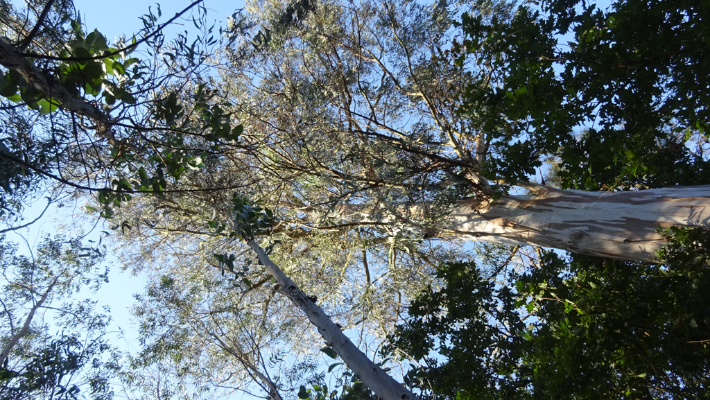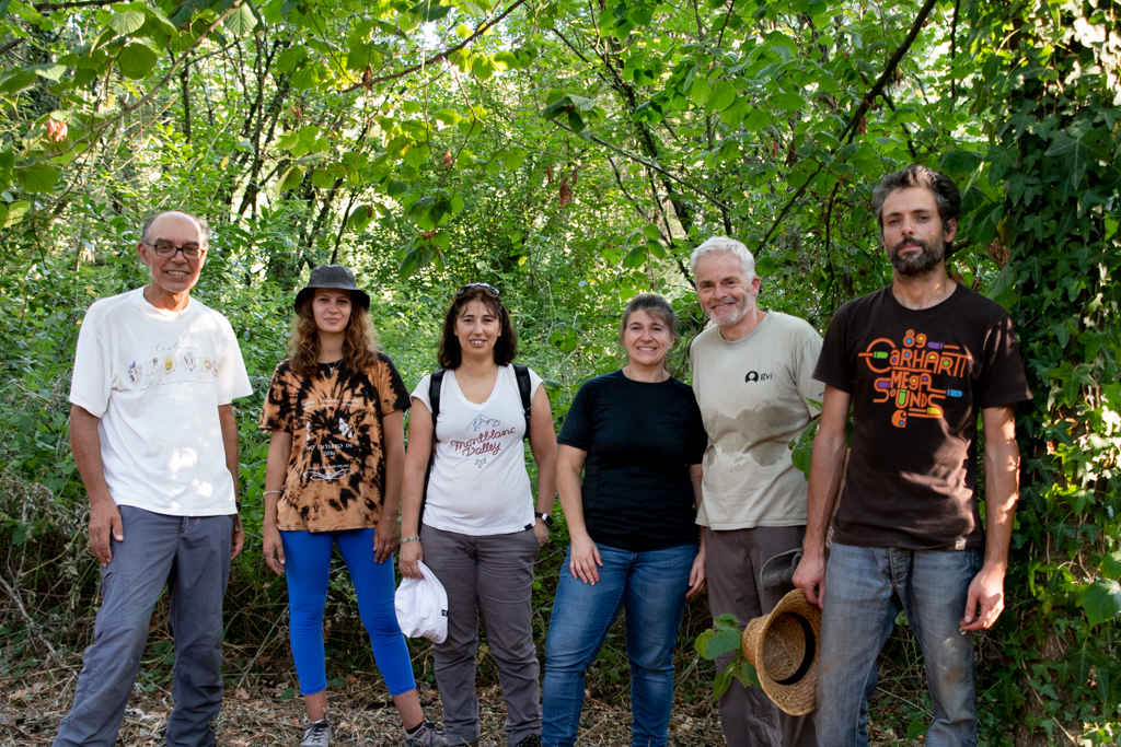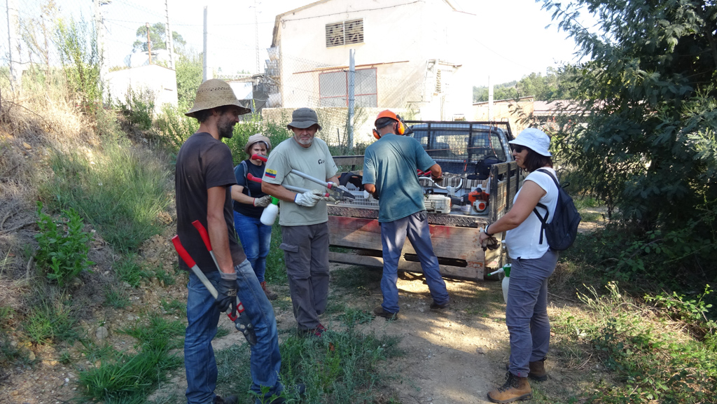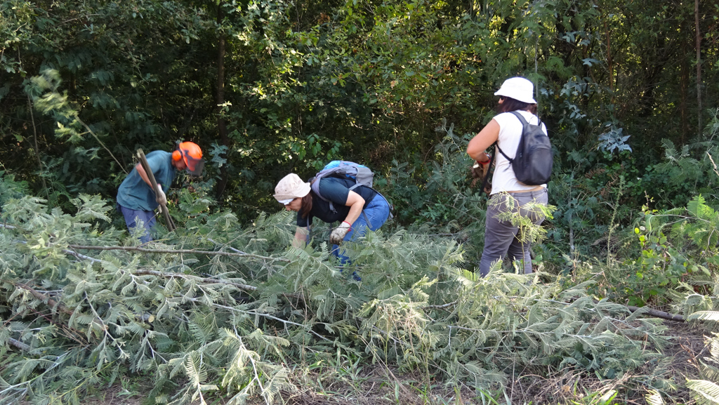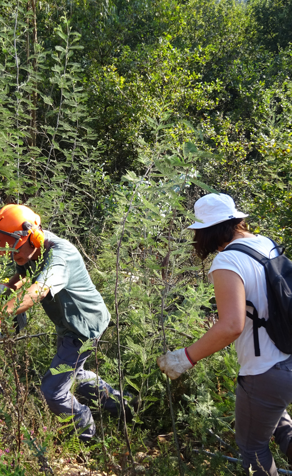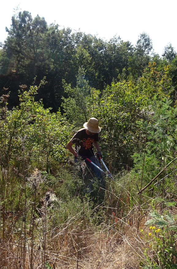 Durante a manhã, aproveitando a maior frescura, a equipa devotou-se energicamente ao trabalho. A zona alvo foi a Lavandeira, aquela encosta muito inclinada em frente a Belazaima onde já tínhamos estado. O trabalho: cortar eucaliptos e mimosas de uma parte da encosta de intervenção mais antiga (esta zona é constituída por várias parcelas onde os trabalhos se iniciaram em diferentes momentos ao longo dos últimos 3 anos). Também se arrancaram eucaliptos de origem seminal e se cortaram rebentos numa área de intervenção mais recente. Verificou-se a emergência de plantas autóctones (espontâneas e semeadas) e algumas receberam cuidados.