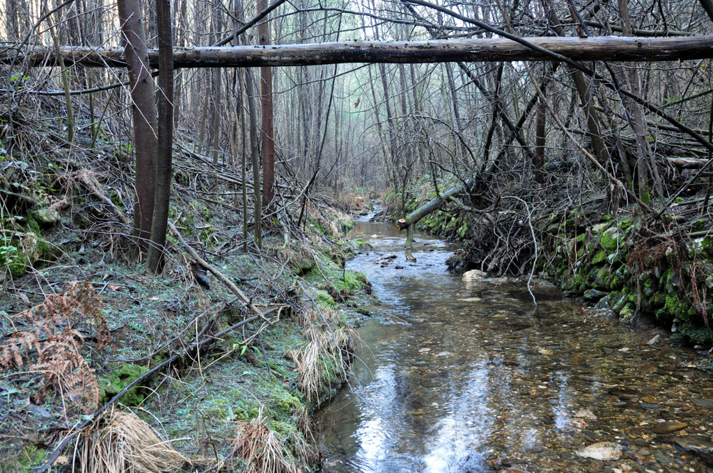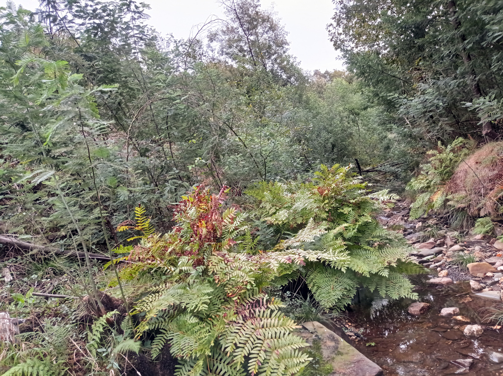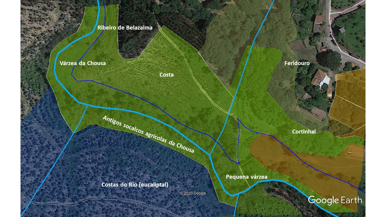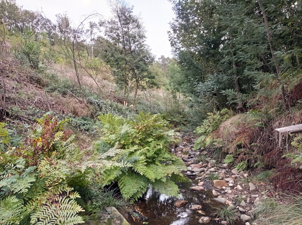 Toda esta extensão estava em 2015 ocupada por uma mancha muito densa de mimosas grandes, sendo a encosta intermédia (“Costa”) um eucaliptal plantado com formação de socalcos a seguir ao incêndio de 2005, mas dominado pelas mimosas na zona ribeirinha. Estas mimosas foram retiradas por fases. Na várzea da Chousa, onde se interveio primeiro, em 2016, os tocos das mimosas foram mesmo arrancados, e o terreno foi limpo e regularizado, tendo-se lá plantado as primeiras árvores em 2017. Como se trata de um terreno fértil e húmido, o silvado cresce vertiginosamente e exige uma atenção regular, mas as árvores e arbustos lá plantados (carvalhos, freixos, amieiros, ulmeiros, azevinhos, azereiros…) também estão bem implantados. Na encosta e na pequena várzea a montante as mimosas foram cortadas em 2018/19, um processo demorado pela dificuldade em retirar o material lenhoso. De notar que na margem sul do ribeiro existiam várias parcelas agrícolas em socalcos, sem qualquer acesso mesmo por carro de bois, só um carreteiro de pé-posto. Aí muitas mimosas acabaram por ficar no chão, dificultando trabalhos posteriores. A pequena várzea a montante, é claro, ficou “famosa” por aí se ter dado início às sementeiras de bolota de 2019, com honras de reportagem televisiva. Mas aqui, apesar de tudo, em particular das germinações massivas de mimosas que vão ocorrendo, todos os trabalhos estão facilitados pela facilidade de acesso e pelo pequeno declive. Já na encosta a jusante, entre as duas várzeas, as coisas são muito mais complicadas: declives elevados, ramadas de mimosa em grandes quantidades depositadas no terreno, silvados impenetráveis, e, é claro, as mimosas, que tentam a todo o custo permanecer num local que já foi delas e onde deixaram abundantes “recursos” de re-invasão: raízes, toiças e sementes.