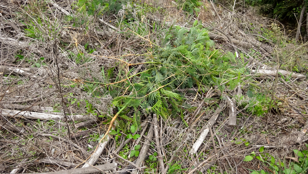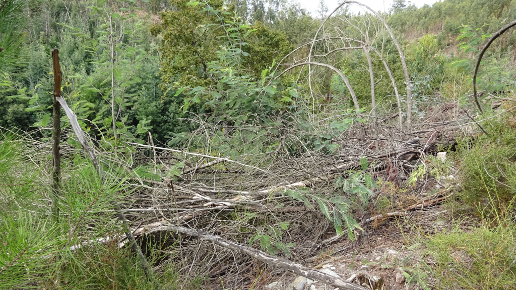 Os trabalhos incluíram as várias técnicas aplicáveis às mimosas: arranque de plantas pequenas, corte de plantas médias (com tesourão ou podadora) e aplicação de herbicida na superfície de corte, e descasque de árvores de maior porte. Também se cortaram eucaliptos que por aqui ainda ocorriam, embora dispersos. A moto-roçadora trabalhou quase todo o tempo no corte do silvado (que, embora não se possa considerar invasor, é no mínimo “oportunista”!) e ainda se fez alguma queima de material lenhoso seco num local em que causava maior estorvo.