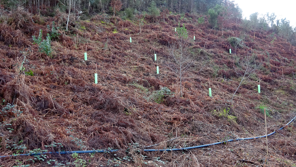 Nas árvores plantadas, algumas delas ainda nas últimas jornadas voluntárias de 2020, colocaram-se estacas e mesmo tubos nas áreas onde o crescimento da vegetação espontânea dificulta a localização e o cuidado posterior das árvores.