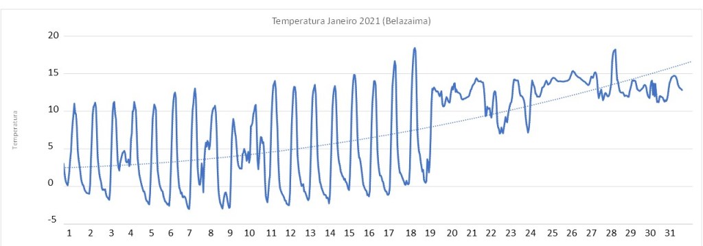 Janeiro começou frio e mais ou menos seco e acabou morno e húmido. O gráfico de temperaturas ilustra bem esta situação.