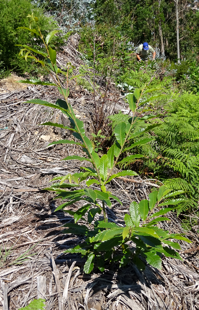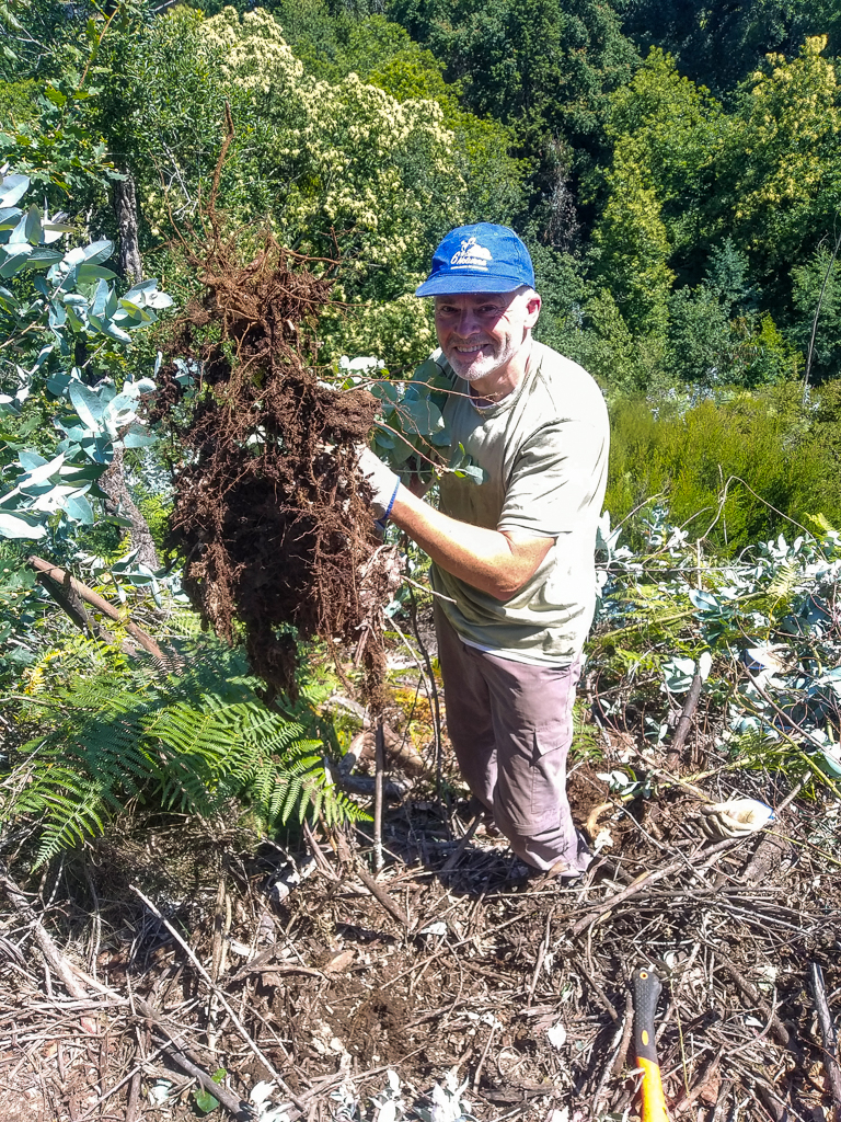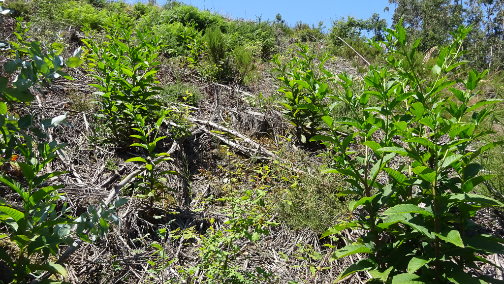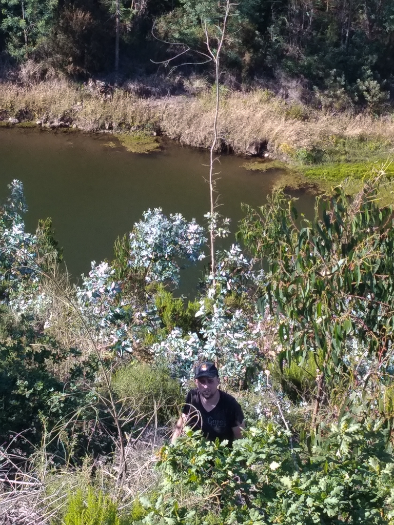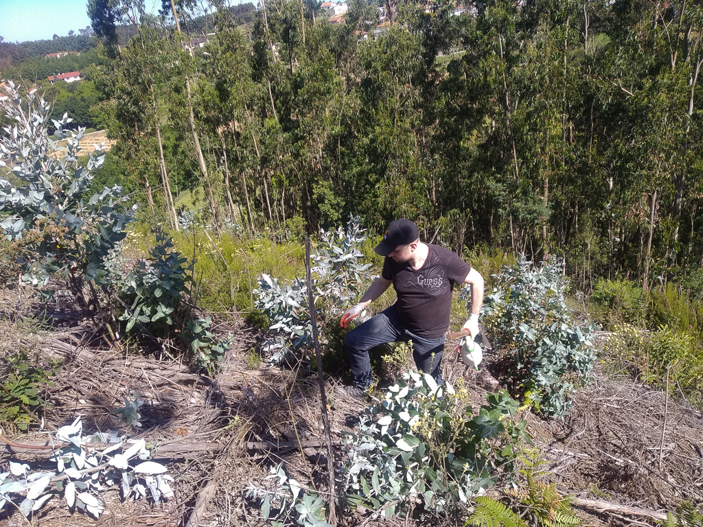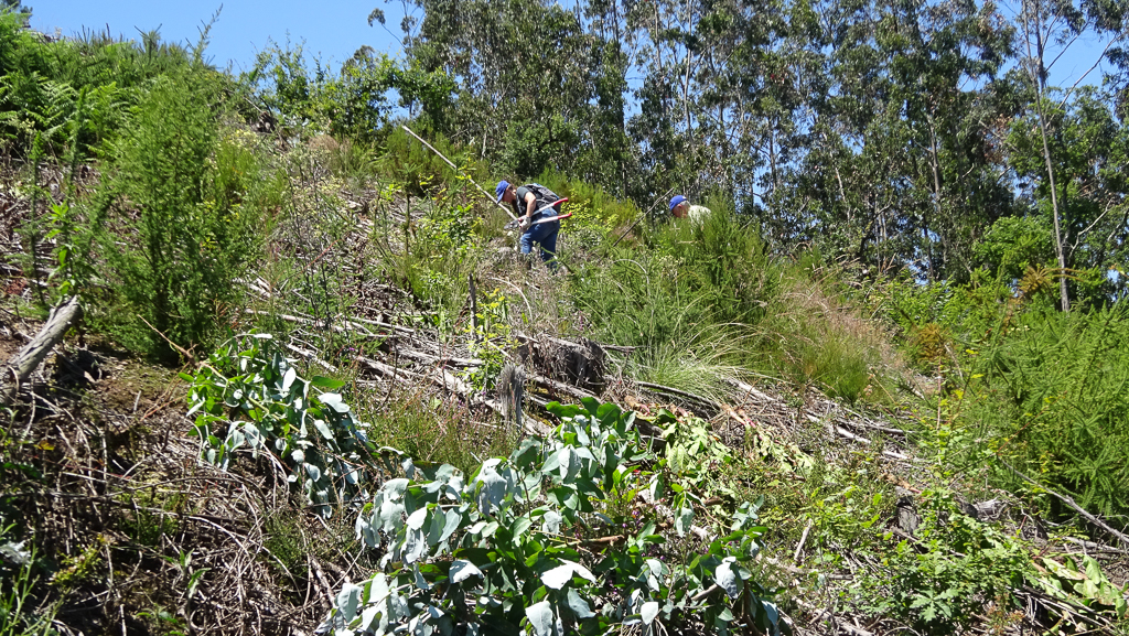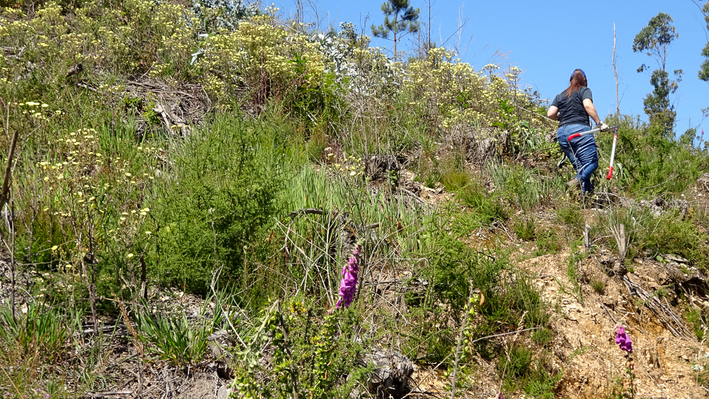 À tarde a equipa deslocou-se ao Lousadelo, uma encosta com características idênticas às da Lavandeira (muito inclinada, mas agora voltada para a represa), e aliás com o mesmo historial e passado de intervenção, mas aqui com mais eucaliptos e mimosas do que na Lavandeira. Já tínhamos trabalhado aqui numa jornada anterior. Deste modo, os trabalhos não foram muito diferentes dos da manhã. Mas aqui a área é mais extensa.