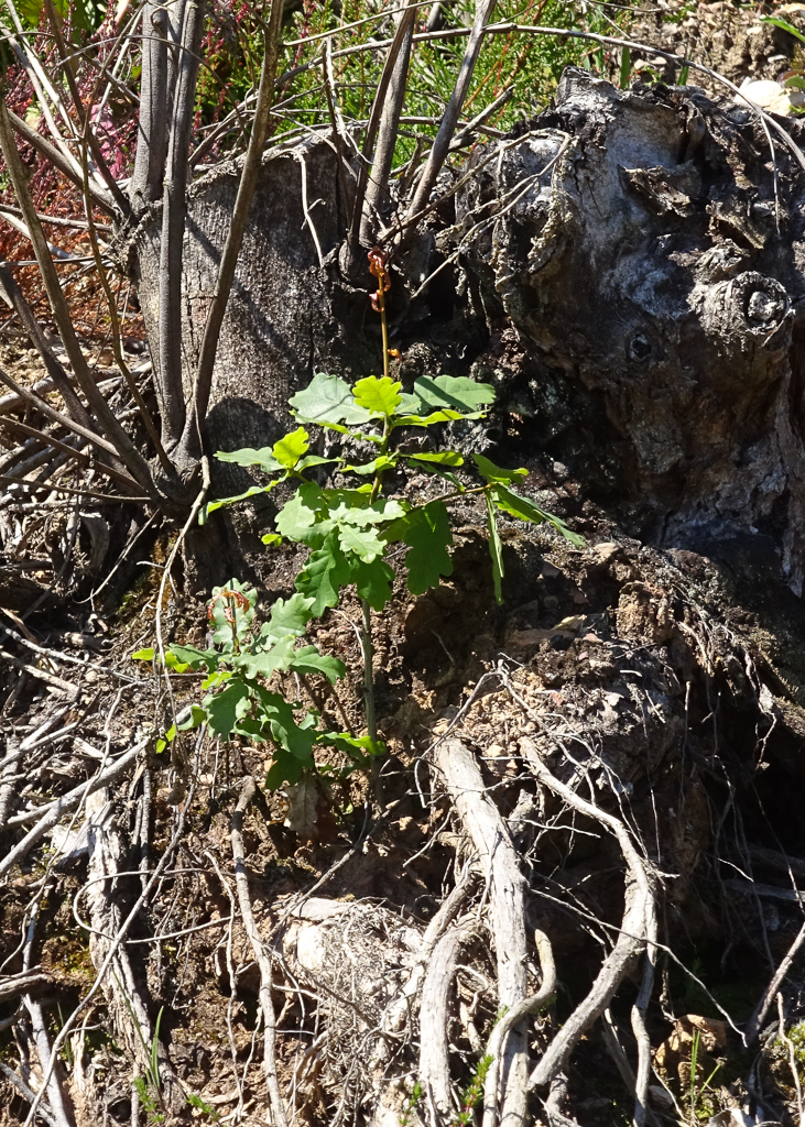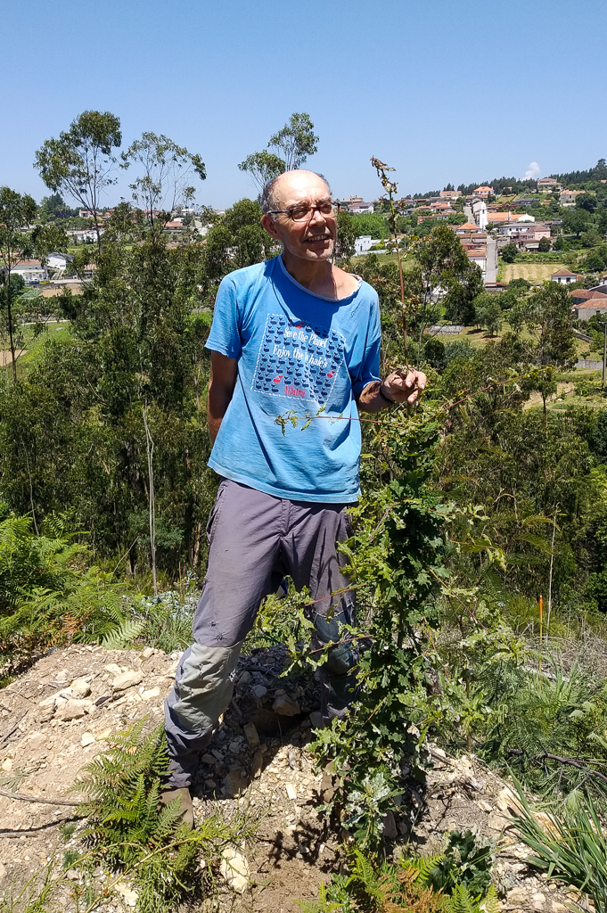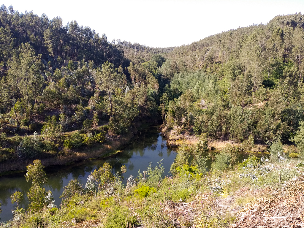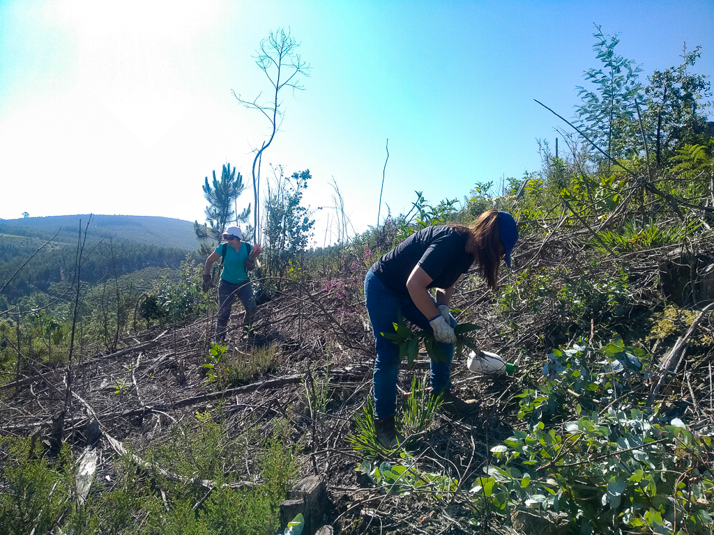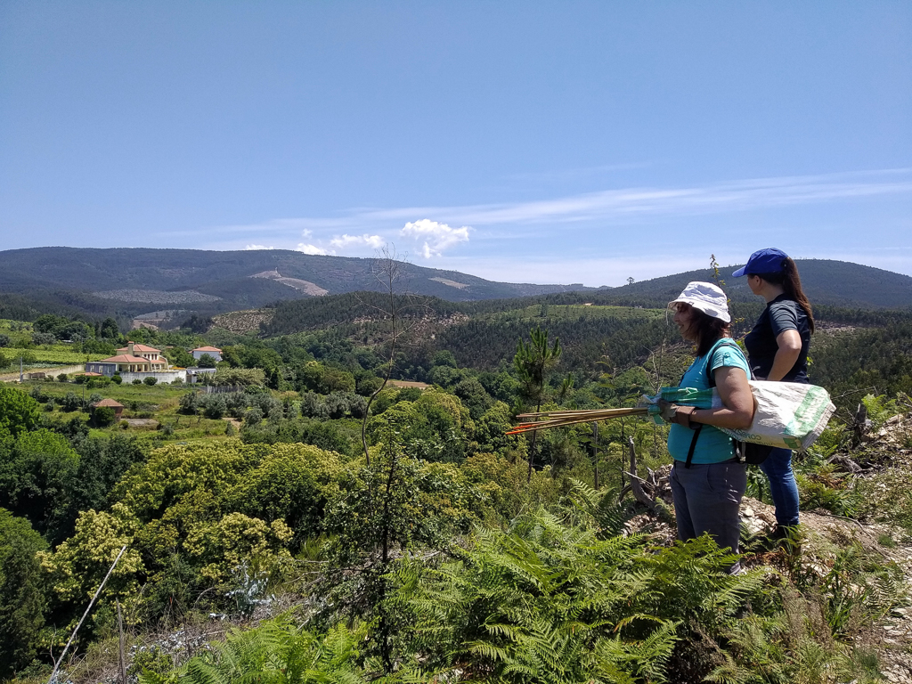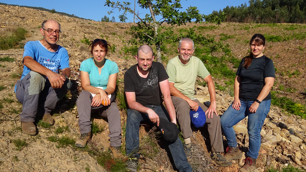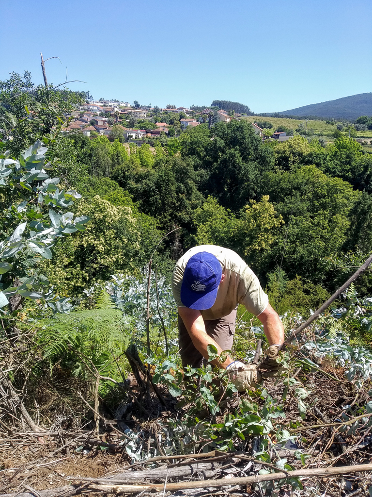A manhã foi passada no Cabeço da Lavandeira, uma encosta bastante inclinada, voltada para a aldeia de Belazaima do Chão. Por aqui já se tinham feito sementeiras e plantações e por isso um dos trabalhos a realizar era a demarcação das plantas autóctones ainda pequenas, com a prestação de algum cuidado de que necessitassem (poda, arranque de plantas concorrentes…). O outro trabalho era o corte ou arranque de espécies indesejadas: os eucaliptos, que aqui já estão numa fase avançada de desvitalização, e as uvas dos tintureiros, que aqui apareceram com significativa expressão. A presença abundante das plantas autóctones manteve o entusiasmo em alta, não obstante as dificuldades de locomoção pelo terreno e o sol de Junho, que foi aquecendo os corpos ao longo da manhã…