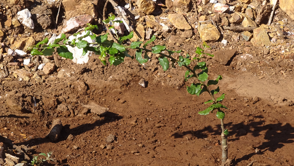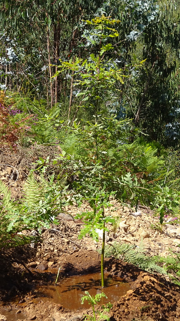 No dia 21 realizou-se a jornada especial de Agosto. Com quatro voluntários presentes, os trabalhos dividiram-se por dois locais: de manhã regaram-se árvores no Vale de Barrocas, as que aqui foram plantadas pela Quinta das Tílias em 3 dias de meados de Março último, após uma preparação mecanizada do solo em 3 ha: mais de 1500 árvores entre carvalhos, castanheiros, sobreiros, medronheiros e até alguns azevinhos, azereiros e bordos! Dois elementos dedicaram-se a ajudar os sobreiros a crescerem direitos, pois que estes têm uma tendência marcada para crescerem para o lado, e também para lançarem ramificação lateral por vezes mais vigorosa do que o eixo central. É necessário remover estas ramificações e tutorar o eixo central. A rega também requer a reconstrução das caldeirinhas de retenção e aproveita-se a oportunidade para remover rebentações inconvenientes ou muito baixas.