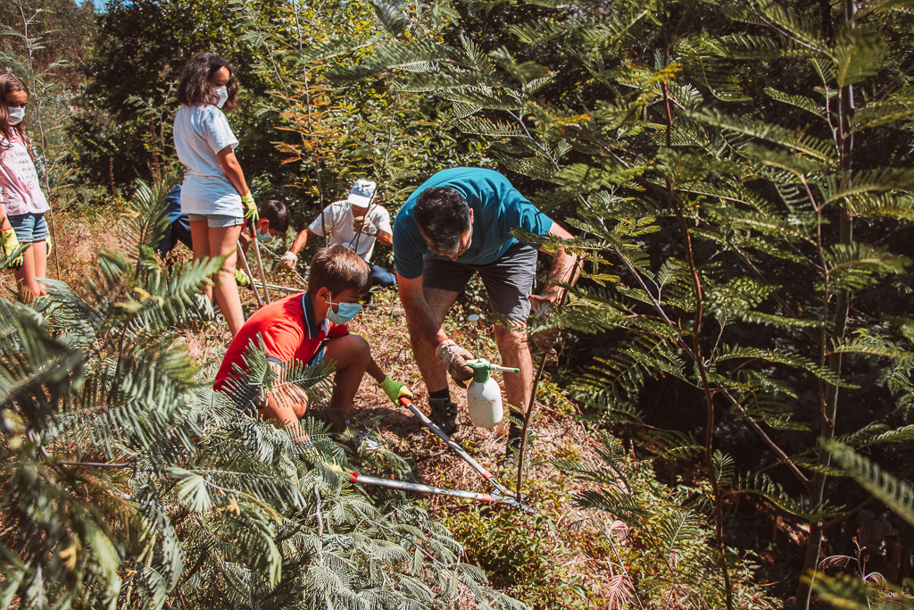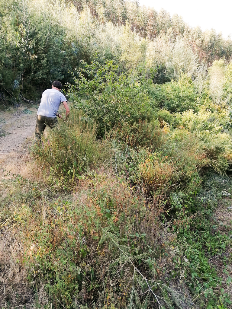 O almoço fez-se sob a sombra dos carvalhos da Ribeira do Tojo, onde também tinham estado as crianças do Luso, um local que apenas há doze anos estava densamente ocupado por mimosas. Por isso, repousar sob esta sombra era duplamente reconfortante… Mas nunca por muito tempo: logo ali ao lado abundavam os motivos para não descansar mais do que o essencial! E foi logo ali que três voluntários se dedicaram durante a tarde a cortar e descascar mimosas numa área afectada pelo incêndio de 2017. O quarto voluntário foi continuar a rega em Vale de Barrocas, até acabar o depósito de 1000 litros de água (mas para regar todas estas árvores são necessários 6 a 7 mil litros!).