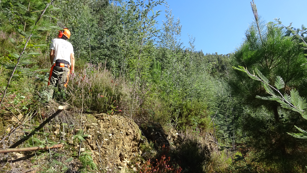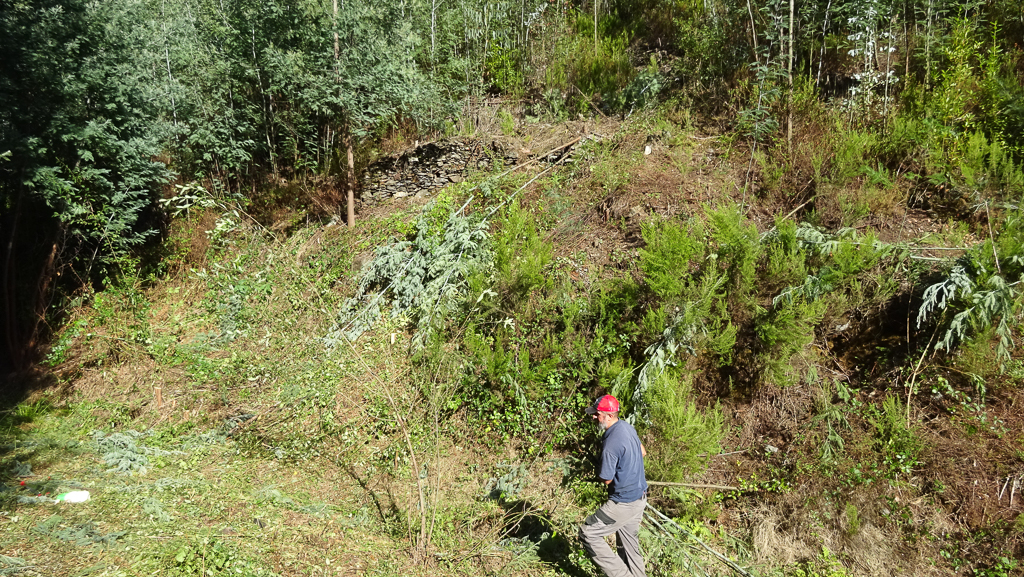 Assim, o trabalho dos voluntários foi essencialmente o corte de mimosas. Mas às vezes o problema era chegar junto delas: num antigo caminho que atravessava o vale, o silvado tinha crescido tanto que não era possível avançar. Solução: moto-roçadora, que trabalhou toda a manhã. Nos socalcos aqui escavados para plantar eucaliptos em 2006, o silvado não estava tão presente, mas também se fez algum corte selectivo de matagal em torno das árvores e arbustos plantados nos últimos anos.