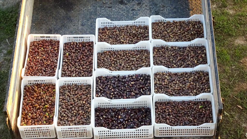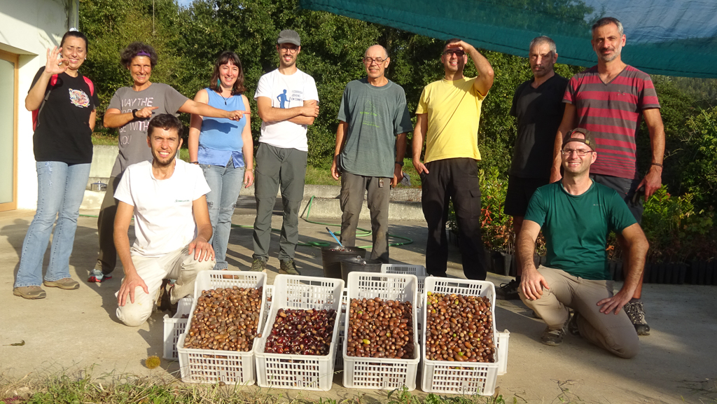 A foto de conclusão com o produto do trabalho presente obteve-se já na sede da Quinta. No dia seguinte, Domingo, as bolotas foram escolhidas (retirando-se as bichadas e estragadas), limpas, pesadas e colocadas numa câmara de frio a fim de melhor se conservarem até à sementeira. Eram 115 kg de bolotas e 15 kg de castanhas. Só de bolotas, umas 15 000, considerando um peso médio de 7,5 g por bolota!