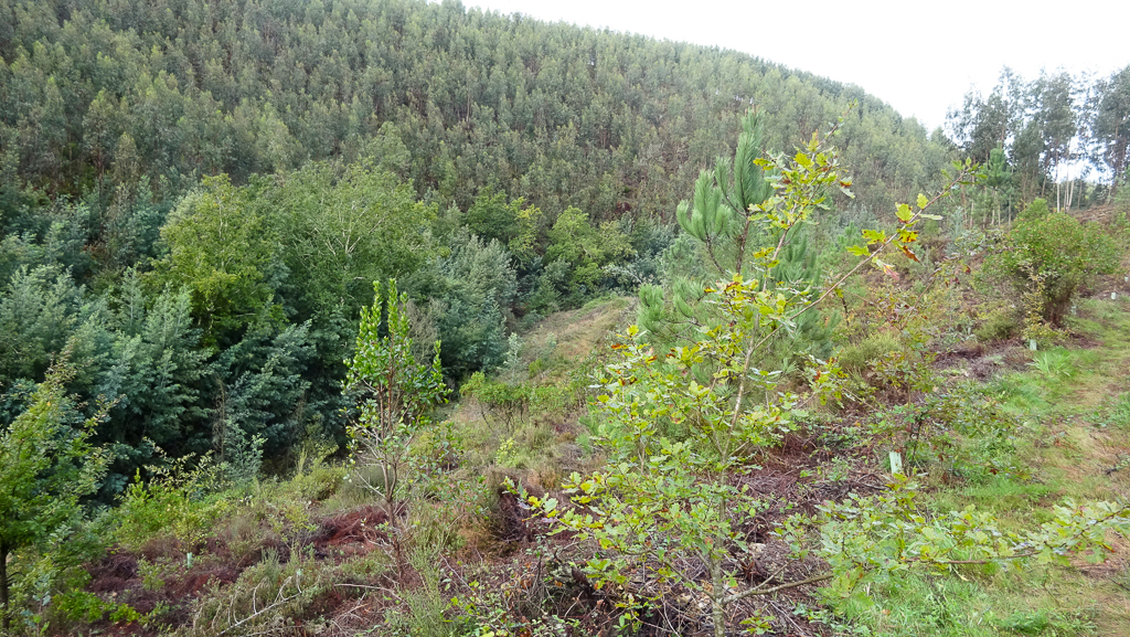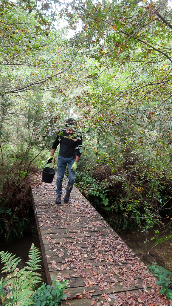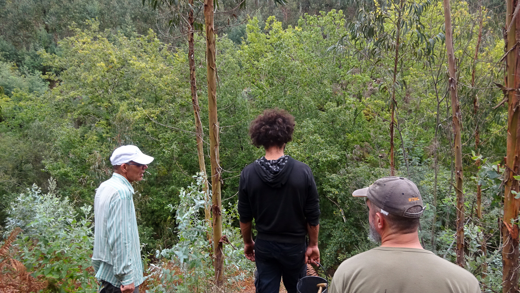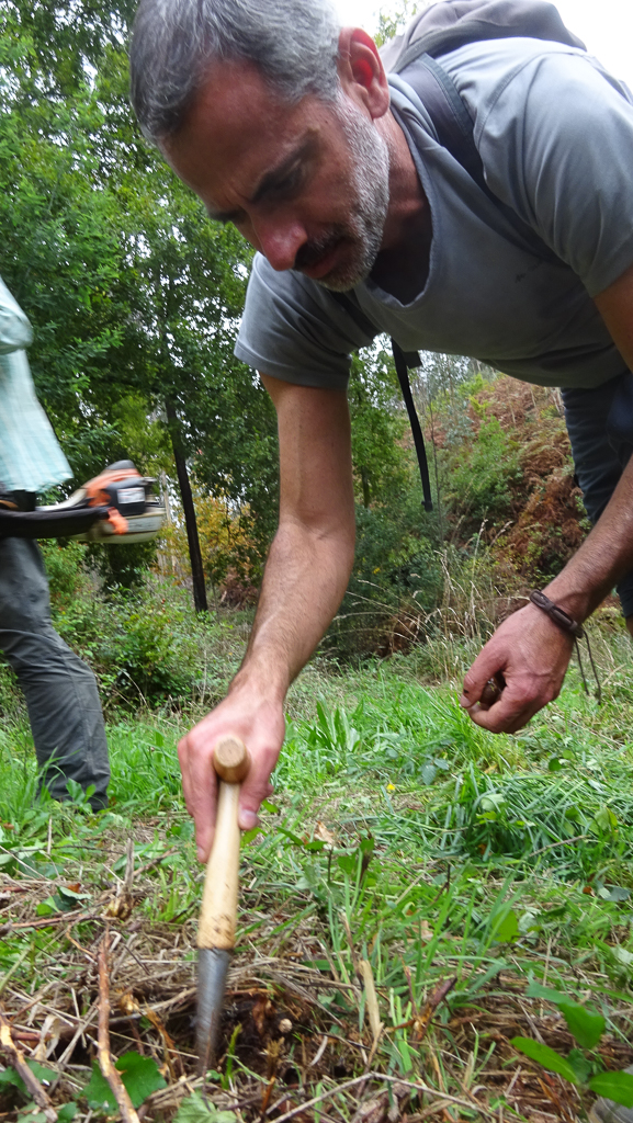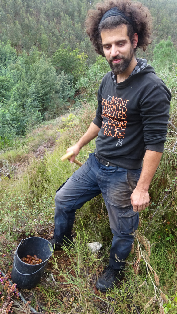 Os trabalhos decorreram numa área imediatamente a jusante da aldeia do Feridouro, que tem merecido uma atenção frequente nos últimos tempos: a zona da Costa/Chousa. Nos socalcos aqui criados para uma antiga plantação de eucaliptos, o projecto plantou, a partir de 2015, carvalhos e medronheiros, mas, nas margens do ribeiro, então densamente ocupadas por mimosas, a sua remoção demorou alguns anos a ser feita (e só na margem norte!), por ter sido um trabalho difícil. Só no ano passado se conseguiu fazer um esforço decisivo para quase eliminar a rebentação remanescente da margem norte, tornando a área disponível para acolher plantas autóctones. Por isso a sementeira deste dia iria privilegiar esta área, mas também se fez nas áreas plantadas, em jeito de adensamento. Em áreas difíceis, como esta, onde as mobilizações de solo passadas alteraram drasticamente a estrutura do solo, as árvores plantadas crescem lentamente ou têm mesmo dificuldade em se aguentar, sendo apropriado complementar as plantações com sementeiras.