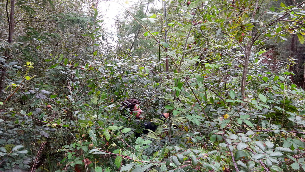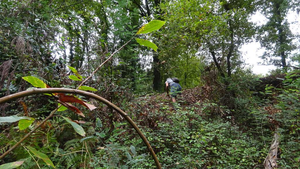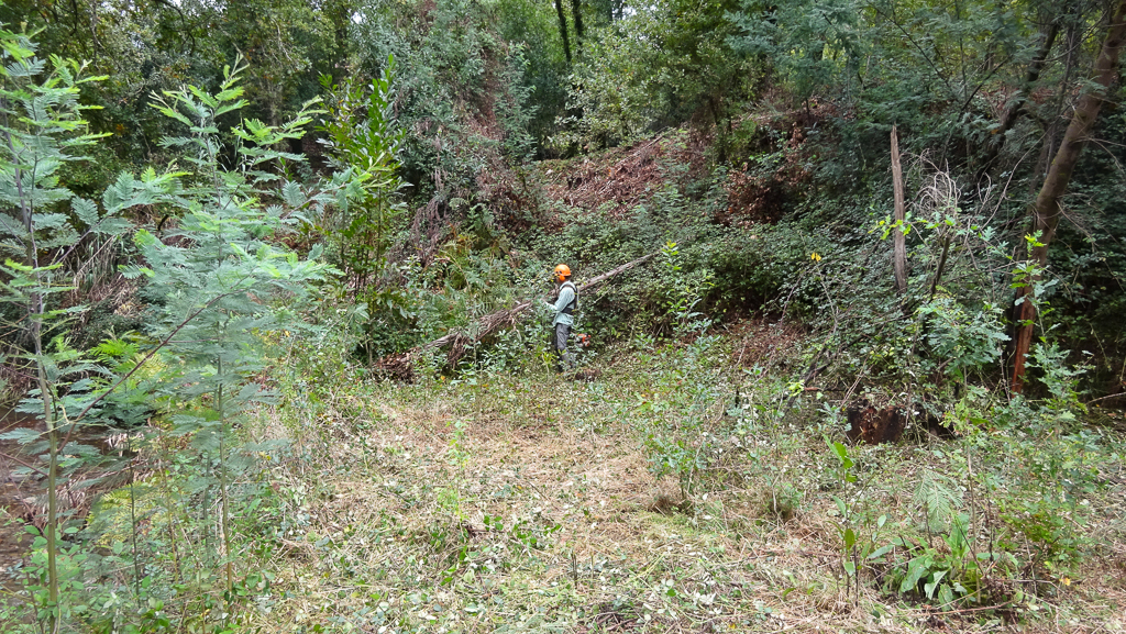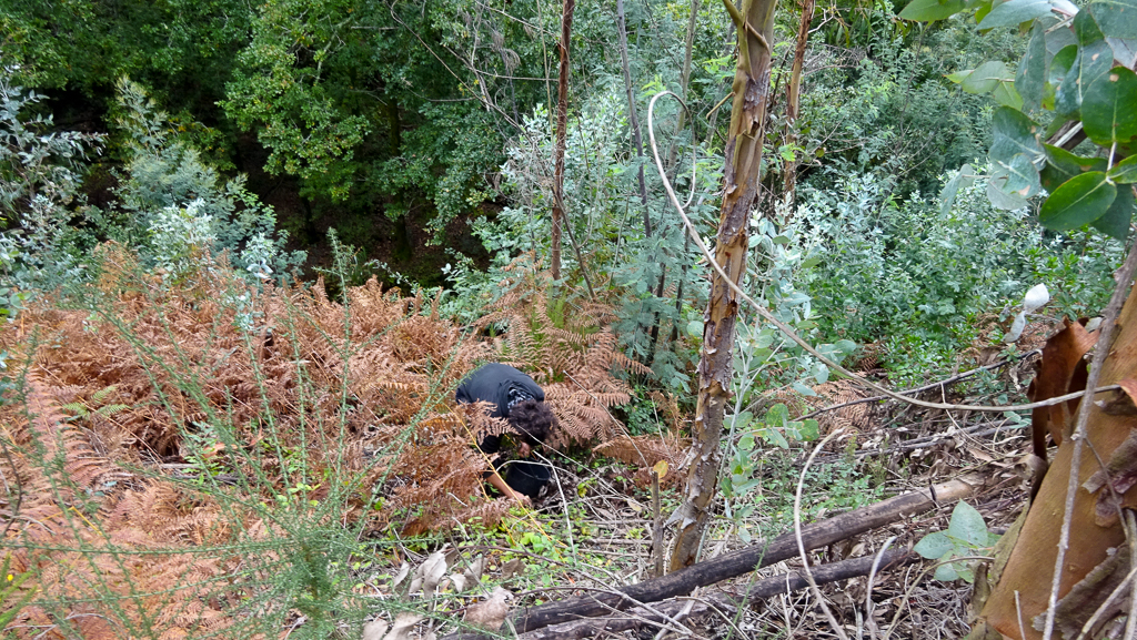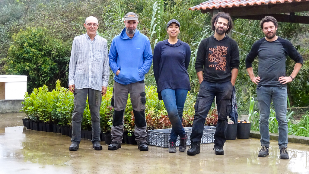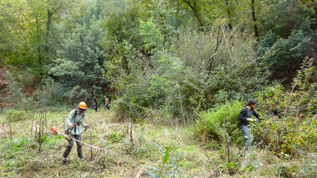 Os trabalhos decorreram numa área imediatamente a jusante da aldeia do Feridouro, que tem merecido uma atenção frequente nos últimos tempos: a zona da Costa/Chousa. Nos socalcos aqui criados para uma antiga plantação de eucaliptos, o projecto plantou, a partir de 2015, carvalhos e medronheiros, mas, nas margens do ribeiro, então densamente ocupadas por mimosas, a sua remoção demorou alguns anos a ser feita (e só na margem norte!), por ter sido um trabalho difícil. Só no ano passado se conseguiu fazer um esforço decisivo para quase eliminar a rebentação remanescente da margem norte, tornando a área disponível para acolher plantas autóctones. Por isso a sementeira deste dia iria privilegiar esta área, mas também se fez nas áreas plantadas, em jeito de adensamento. Em áreas difíceis, como esta, onde as mobilizações de solo passadas alteraram drasticamente a estrutura do solo, as árvores plantadas crescem lentamente ou têm mesmo dificuldade em se aguentar, sendo apropriado complementar as plantações com sementeiras.