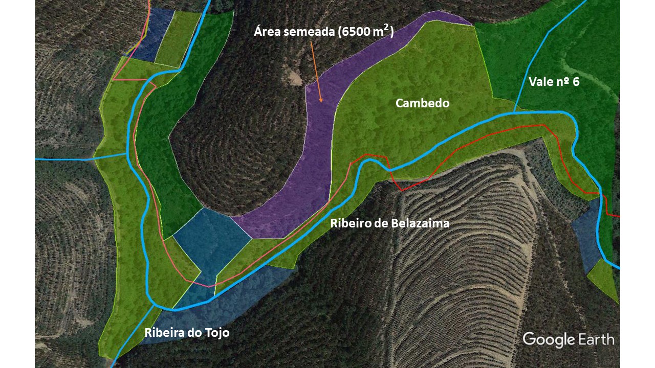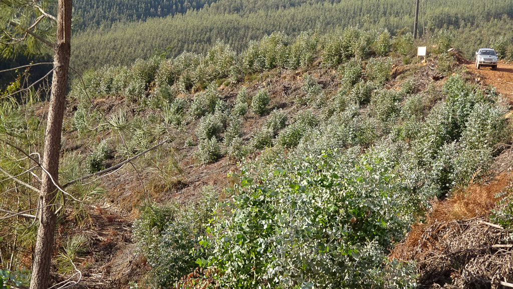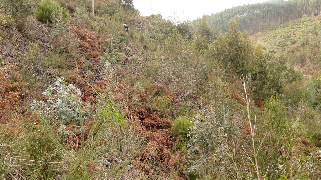 Os trabalhos decorreram em dois locais algo distantes um do outro. De manhã, semeou-se uma área na mata da Altri Florestal que será alvo de reconversão do eucaliptal. Esta área, com c. de 6500 m2, fica junto a outra, já fora da mata, onde o projecto trabalha desde 2009, na zona do Cambedo. Nesta já se encontra uma bela mancha de carvalhal, embora as mimosas ainda se possam observar. Na área nova, para além dos rebentos de eucalipto, que ainda lá se encontram, havia uma densa mancha de háquea-picante, cujas plantas tinham sido cortadas antes do corte do eucaliptal. Felizmente, parece que a grande maioria dessas plantas não rebentou, embora num caminho aberto para a retirada da madeira se encontrem muitas germinadas. Por outro lado, o solo ficou densamente coberto pelas plantas de háquea cortadas, para além das ramadas de eucalipto, o que muito dificultou o trabalho de sementeira.