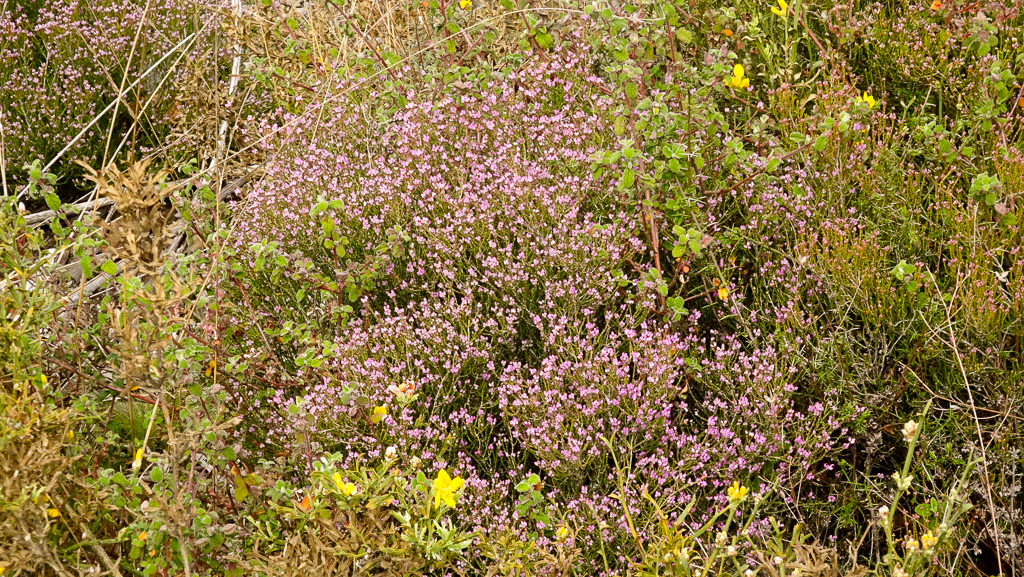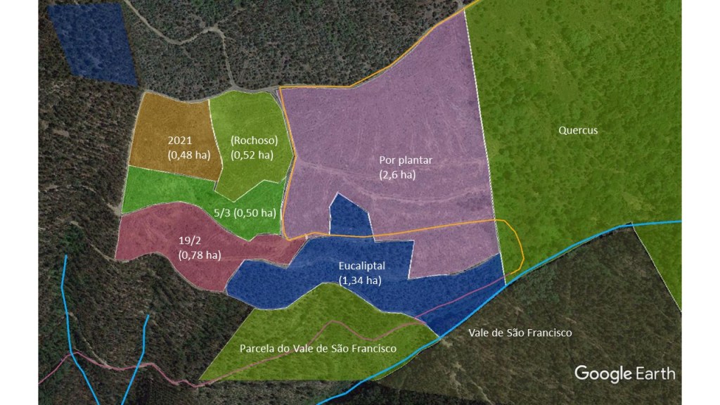 A Primavera já se adivinhava em cada recanto, sobretudo na sub-parcela vizinha não mobilizada, onde o matagal se prepara para a plena floração, com a carqueja a ir na dianteira. Alguma atenção mereceram também as árvores plantadas ainda em 2021, que se apresentam com bom vigor, apesar de terem sido plantadas já em Abril.
