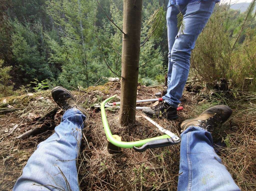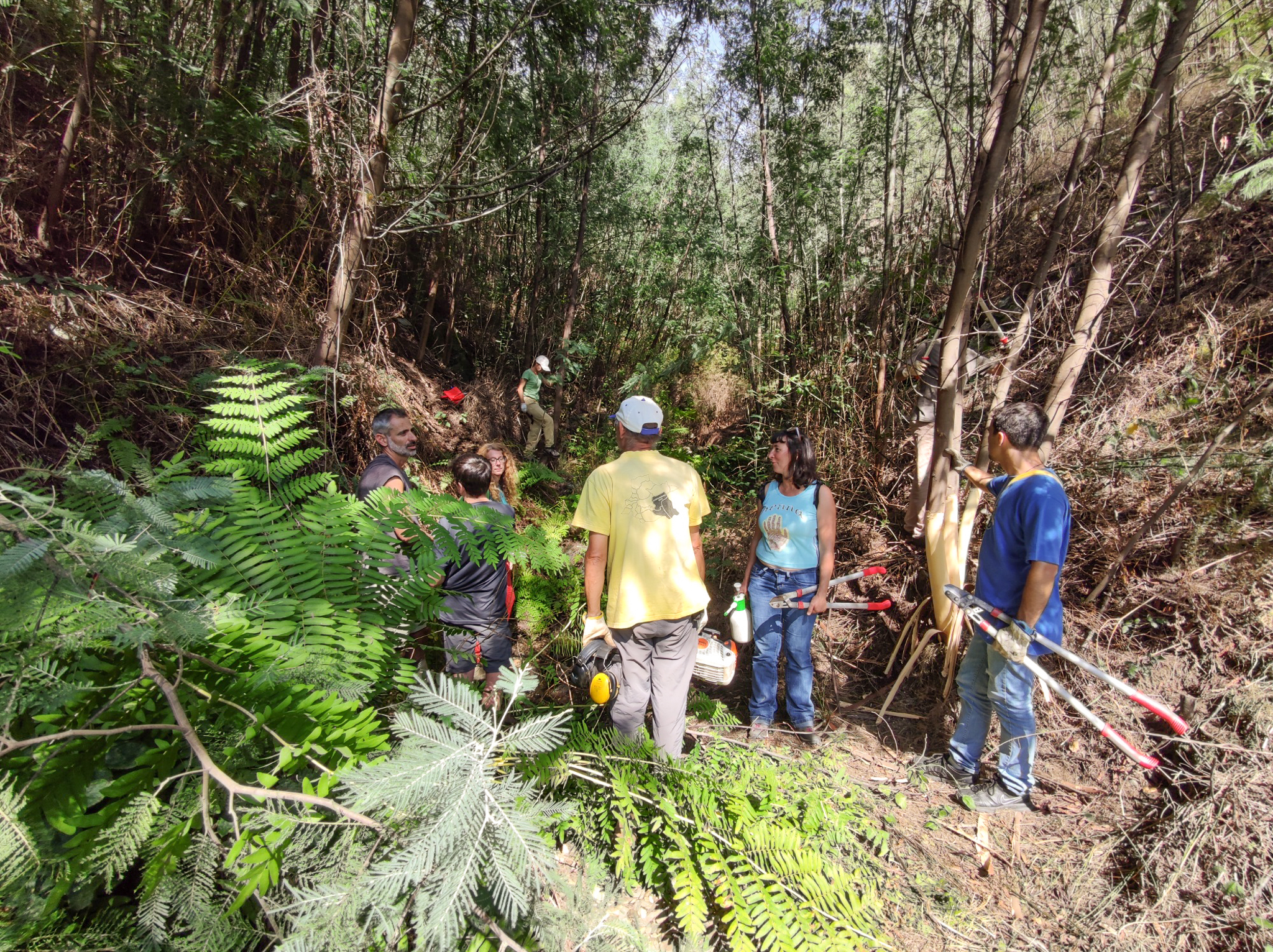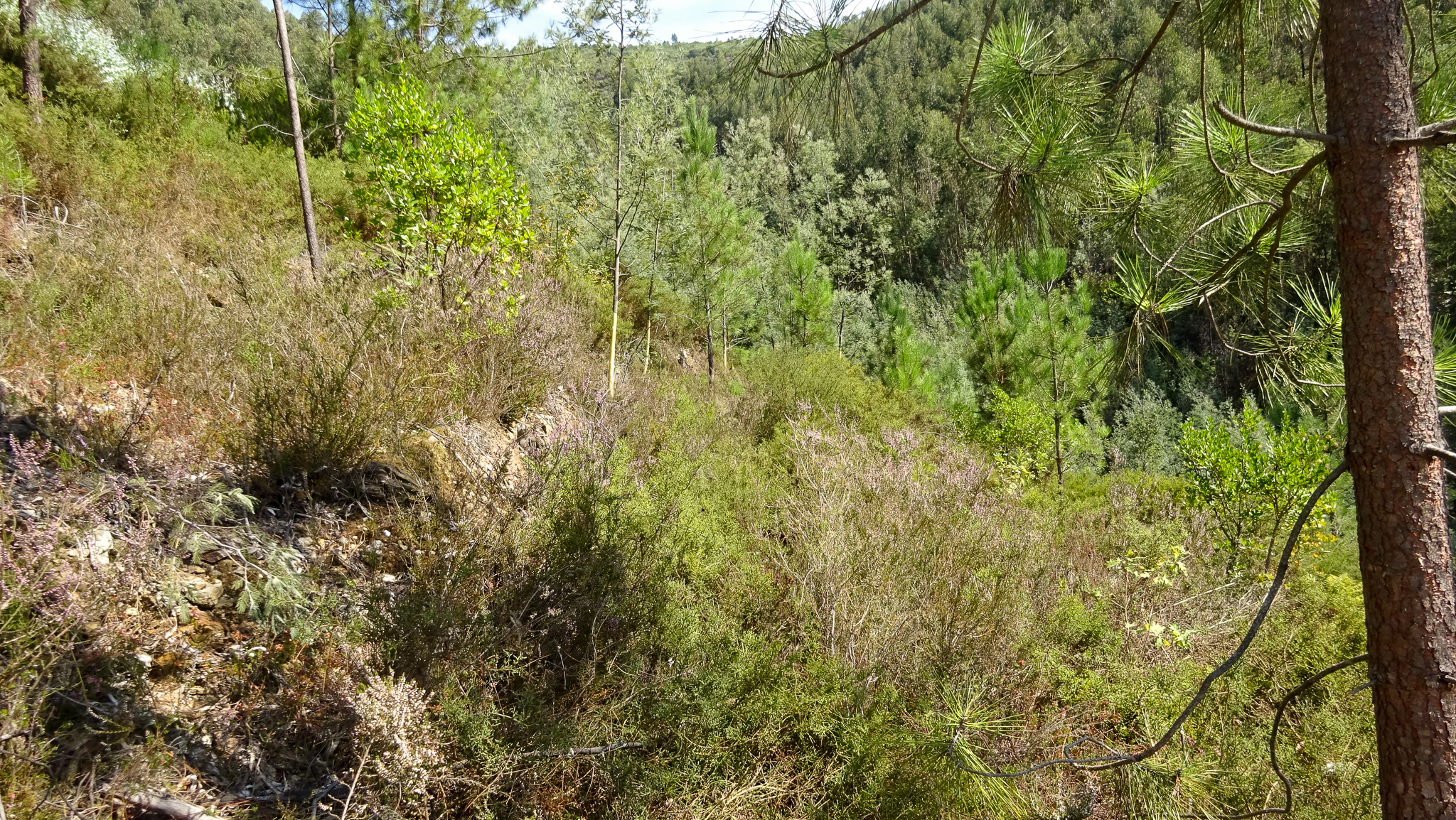 Mas de manhã a equipa ainda trabalhou sobretudo nuns socalcos que aqui foram abertos há mais de 15 anos para plantar eucaliptos, o que, se impactou muito o solo, também permite movimentos mais fáceis ao longo de um terreno de elevado declive. Enquanto isso, uma moto-roçadora ia limpando o silvado que impedia o acesso ao coração do vale.