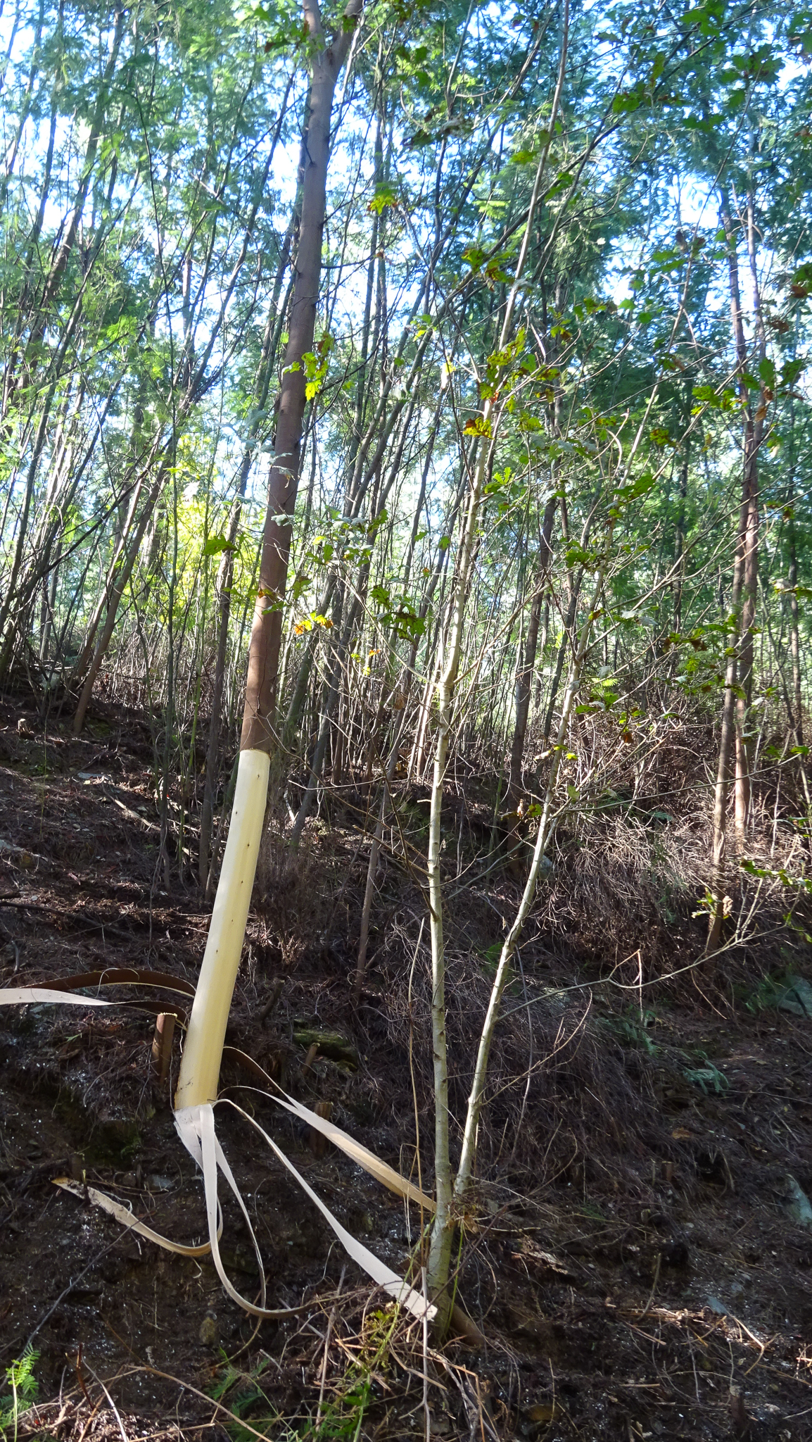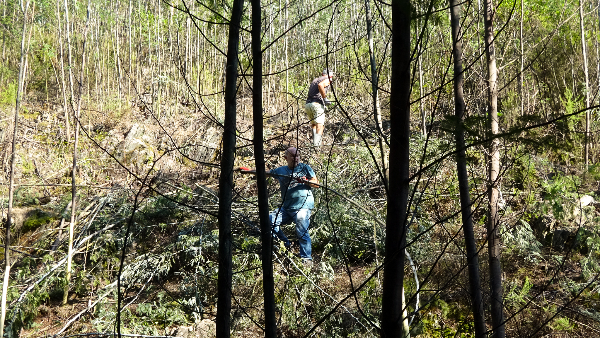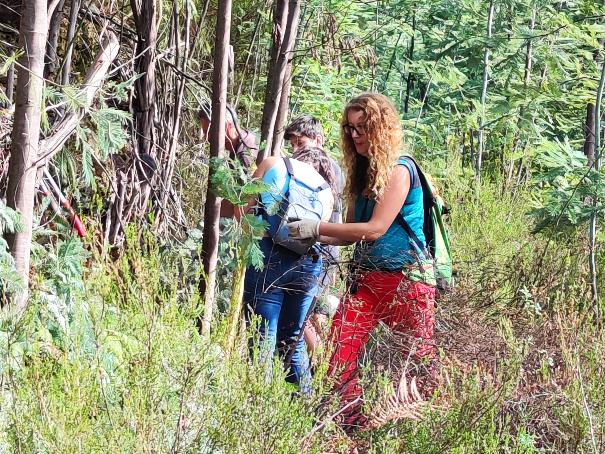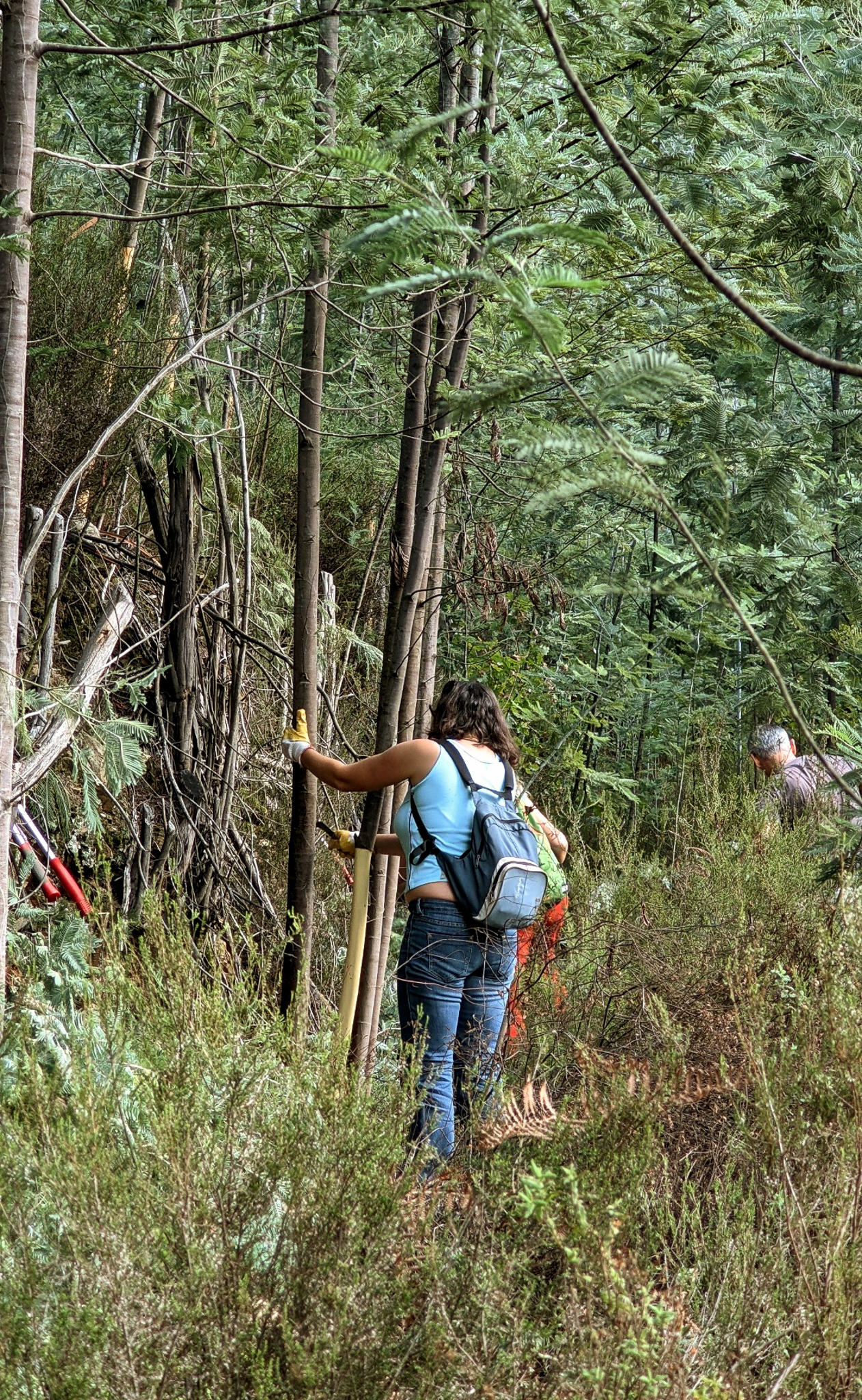 À tarde, já com o silvado cortado, a equipa embrenhou-se então no coração do vale e encostas adjacentes, cortando mimosas pequenas e médias, arrumando as respectivas ramadas e descascando as maiores. A temperatura ainda superou os 30ºC, e, como o vale tem uma orientação nordeste-sudoeste, à tarde o sol iluminava-o em cheio e as camisas suaram bastante, ainda que parecesse que a sombra das mimosas ajudava a refrescar.