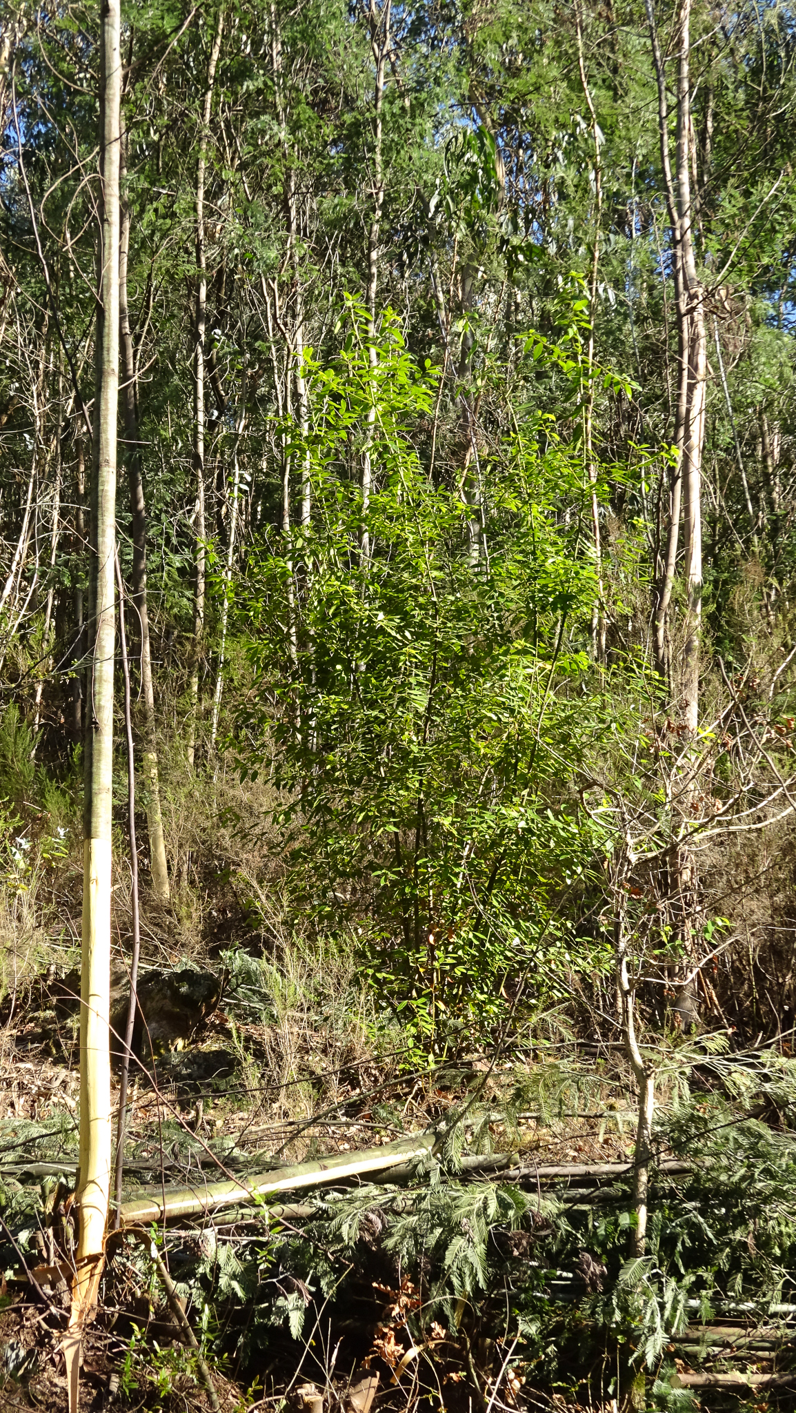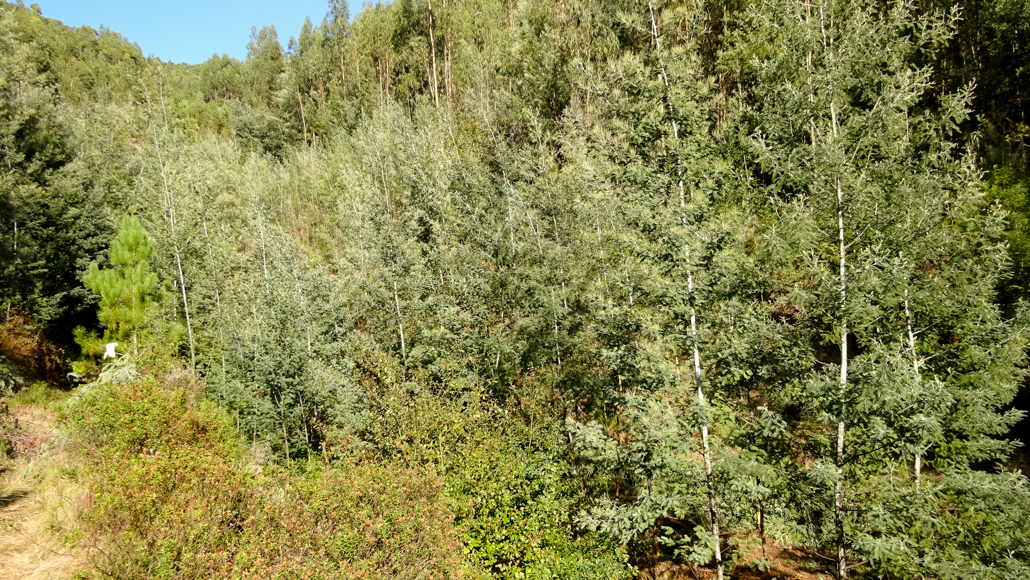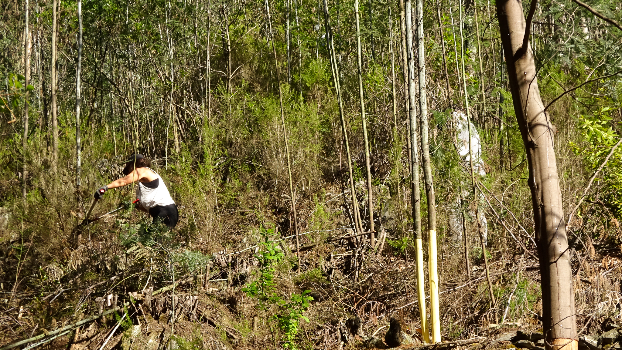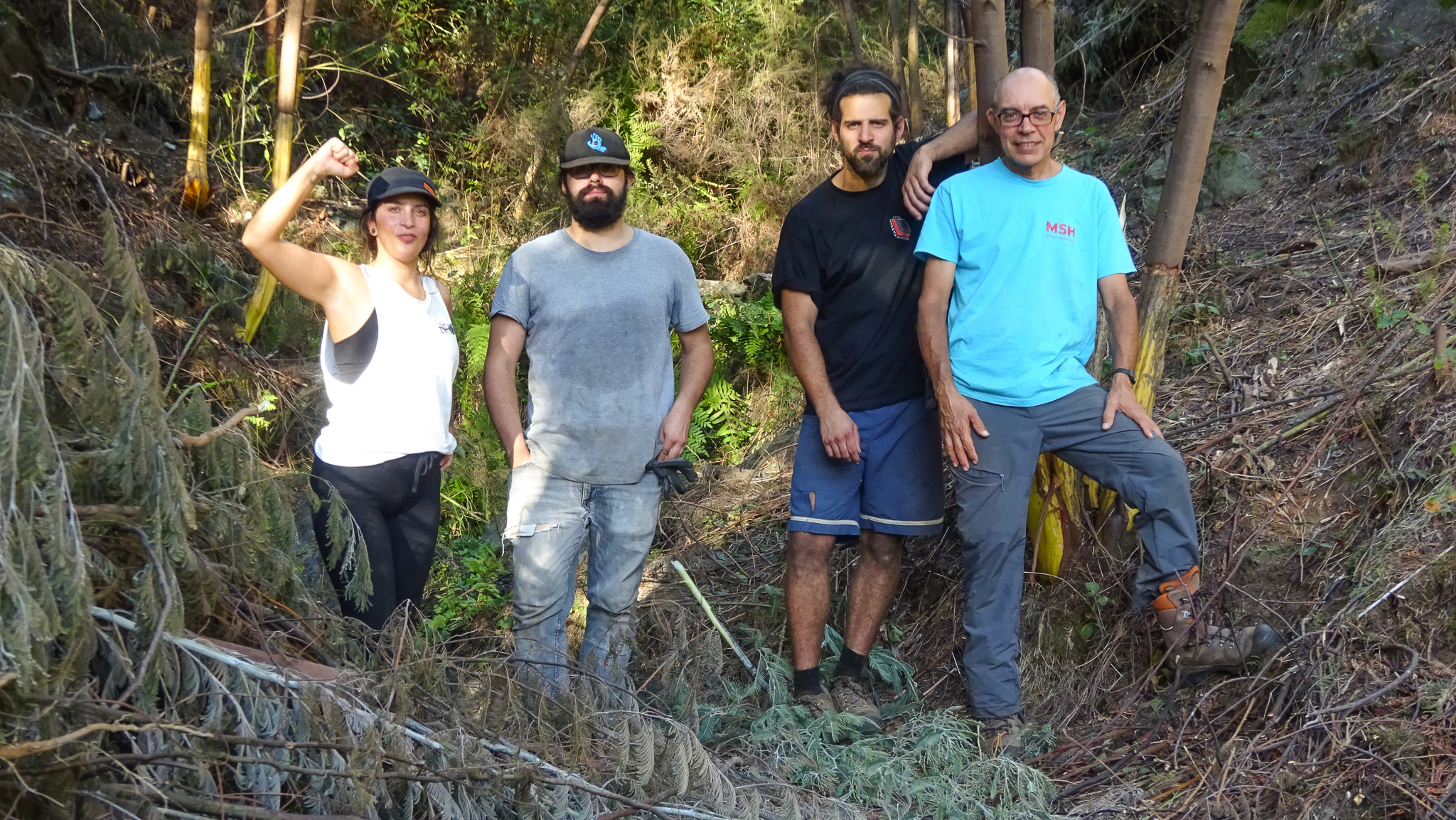 Os trabalhos têm-se desenrolado em torno do primeiro desses caminhos (a seguir à estrada), e nesta jornada fizeram-se avanços determinantes. A moto-roçadora, que trabalhou quase todo o dia, cortou silvado quase até à estrada, permitindo o acesso às mimosas e também às árvores e arbustos autóctones que por aqui se encontram com abundância. A restante equipa descascou, cortou e arrumou mimosas.