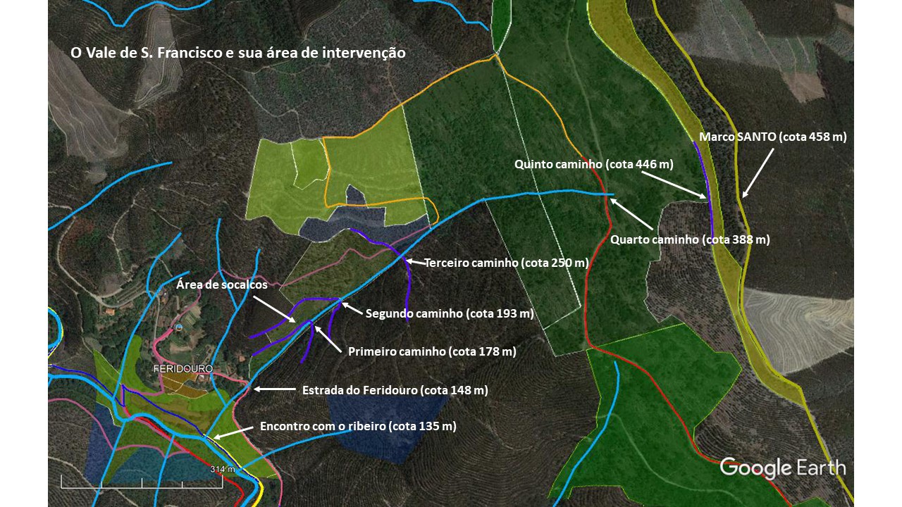 O local escolhido para os trabalhos foi o Vale de São Francisco, onde temos colocado alguma prioridade ultimamente por ainda não correr água e isso facilitar os movimentos em torno do vale. O declive das encostas adjacentes ao vale é elevado, e tudo o que contribua para facilitar a abordagem deve ser aproveitado. Numa zona foram escavados socalcos para plantar eucaliptos em 2006, e, apesar de elevado impacto da operação, isso facilita os movimentos, embora, para passar de um socalco a outro quase seja precisa uma escada!