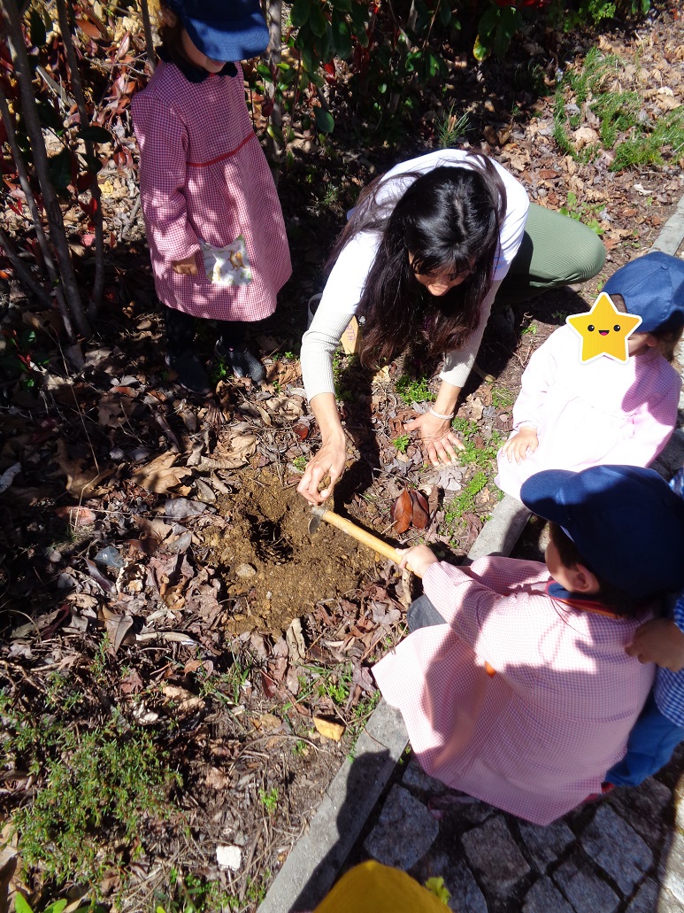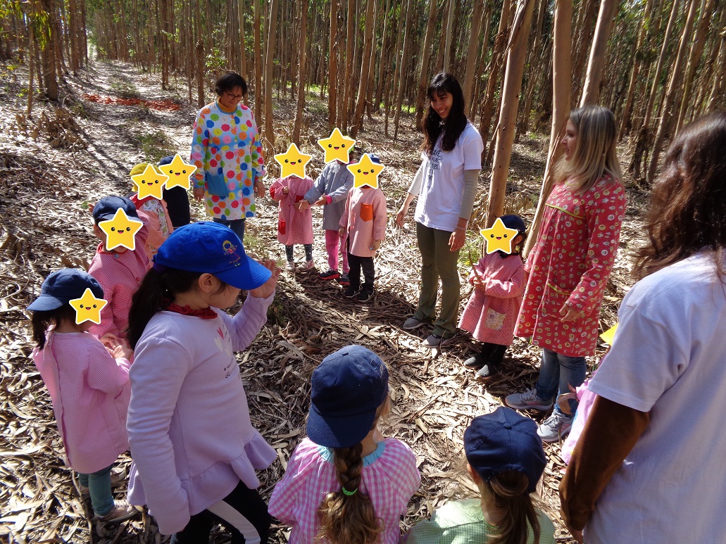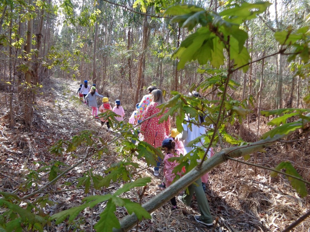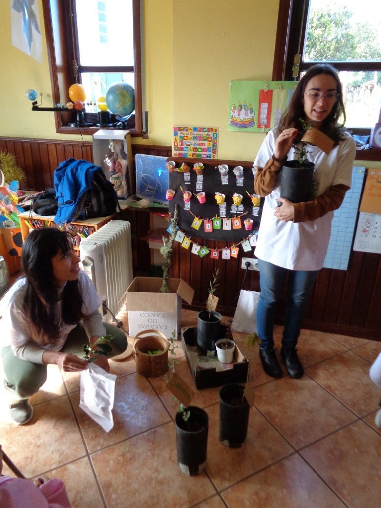 “Celebração da Primavera – Reconhecer a flora nativa como fundamentais nos ecossistemas da Floresta” – No dia 20 de Março, assinalando a chegada da Primavera, realizamos esta ação de sensibilização no Jardim de Infância em Castanheira do Vouga. Após uma breve apresentação de algumas espécies de flora nativa, como o carvalho, o sobreiro, o azevinho, o lentisco e a murta, as crianças criaram a sua própria arte usando tintas naturais e as folhas destas árvores e arbustos como moldes e inspiração. De seguida, realizamos uma pequena saída de campo incentivando a exploração livre e observação detalhada de elementos da natureza, como alguns cogumelos, insetos, aves e identificação de plantas e árvores. Terminámos este passeio com um exercício de respiração e conexão com o interior e exterior. Por fim, regressando à escola, plantámos uma murta em conjunto com as crianças, que se comprometeram a vigiar e cuidar da mesma. Foi uma experiência bastante positiva onde as crianças demonstraram curiosidade em relação aos temas e apresentaram claras aprendizagens. É visível o excelente trabalho em educação ambiental realizado pelas educadoras deste jardim de infância, que por sua vez se mostraram muito recetivas à nossa iniciativa e às quais estamos muito gratos. Em breve, serão estas crianças e educadoras a virem ao nosso encontro no Cabeço Santo em Belazaima do Chão, onde irão poder desfrutar da experiência imersiva numa floresta em processo de regeneração em que promovemos a biodiversidade.