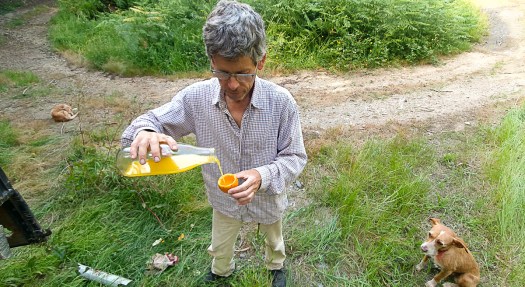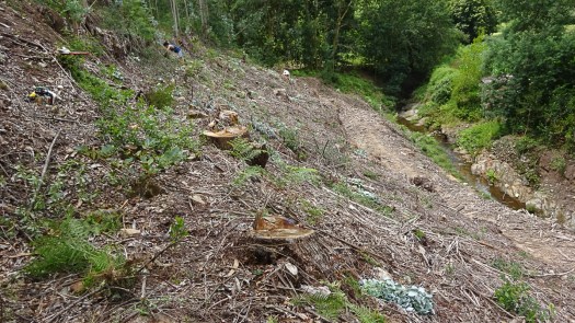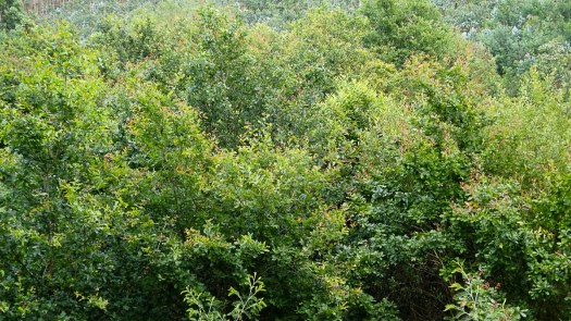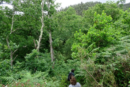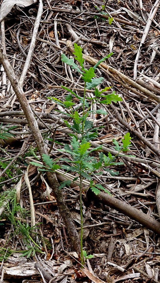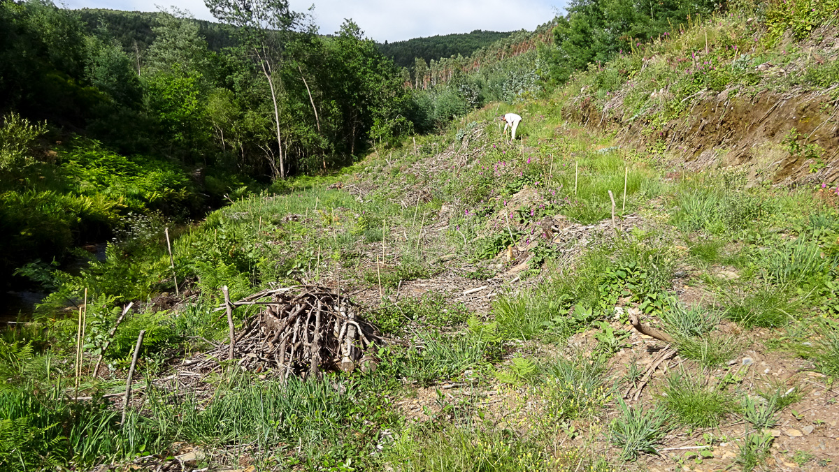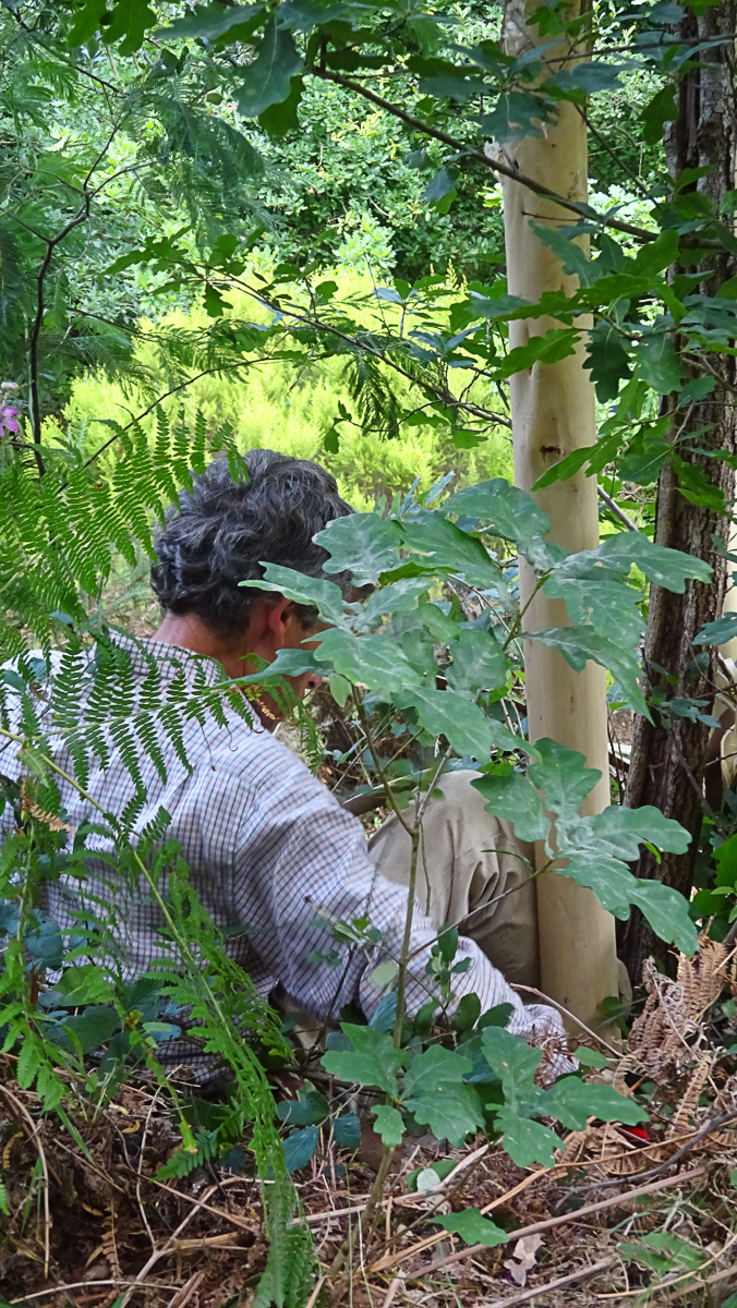 À tarde a equipa deslocou-se até à Ribeira do Tojo. Num primeiro momento continuou-se, e aliás terminou-se, o trabalho iniciado na jornada de 11 de Maio de corte de silvado e corte ou descasque de mimosas que ainda ocorrem no interior da mancha de carvalhal mais antigo da margem sul do ribeiro. Depois, já a tarde se encaminhava para o fim, ensaiou-se um trabalho idêntico ao da manhã, mas agora nas áreas novas, recentemente plantadas na Ribeira do Tojo. Aí a rebentação das exóticas (que também foram cortadas sem qualquer aplicação de herbicida) estava mais atrasada do que no Vale da Estrela, mas desde já ficou planeado voltar ali na primeira jornada de Verão, para fazer um varrimento completo das parcelas, remover a rebentação das exóticas e dar cuidados às árvores instaladas. Umas poucas estavam em dificuldades, mas, não obstante terem sido plantadas tarde, sobretudo as da margem norte, em geral estão a aguentar-se bem… Claro, a principal prova –o Verão – ainda não chegou, mas nessa altura pelo menos uma rega será conveniente. Logo veremos.