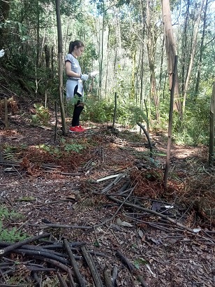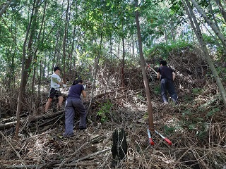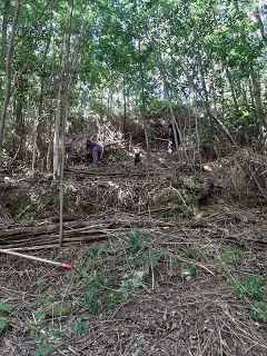 A encosta adjacente, que apresentava acúmulos de silvas e acácias provenientes de intervenções anteriores, também foi objeto das nossas ações. Criamos linhas de contenção que não apenas ajudaram a organizar este material, mas também facilitaram a passagem na encosta, tornando a área mais acessível e manejável para futuras intervenções.