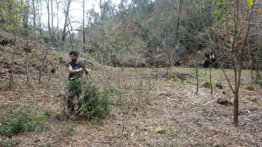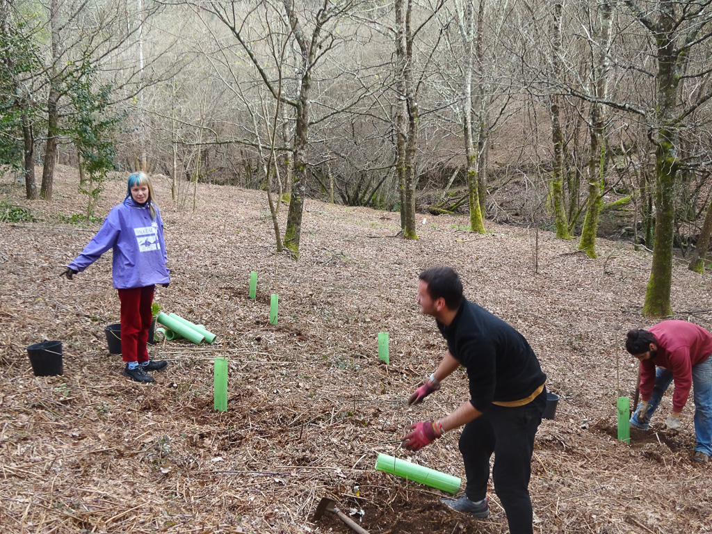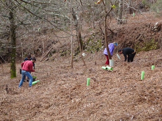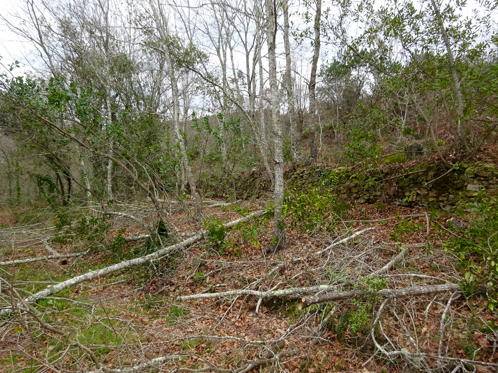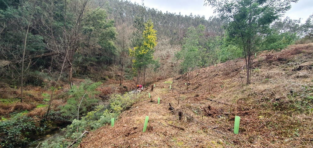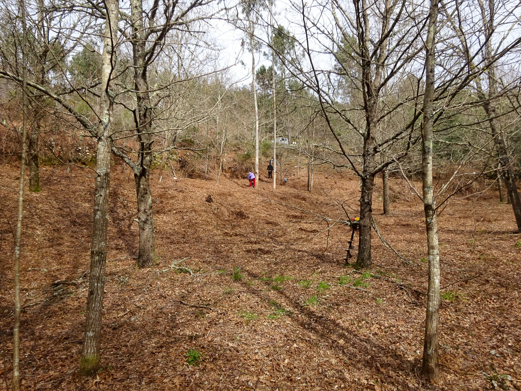 Assim, e depois de uma primeira jornada de Inverno sem voluntários, no dia 18 plantaram-se árvores na Costa e na Chousa (duas zonas contíguas logo a jusante do Feridouro). A Costa é uma zona difícil porque em 2006 foram aí escavados socalcos para plantação de eucaliptos e o solo ficou desestabilizado. A partir de 2015 foram aí plantados os primeiros carvalhos e medronheiros, mas tiveram um desenvolvimento lento. Nas margens do Ribeiro foram necessários anos para desalojar as muitas mimosas que aí estavam bem estabelecidas. Ao longo dos anos foi também crescendo o matagal e o silvado. Com o corte quase total deste último e selectivo do matagal, abriram-se espaços ainda livres para adensamento.
