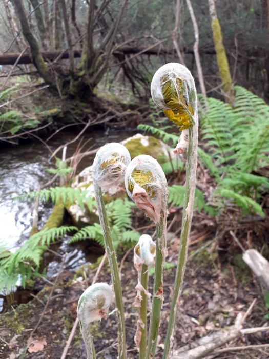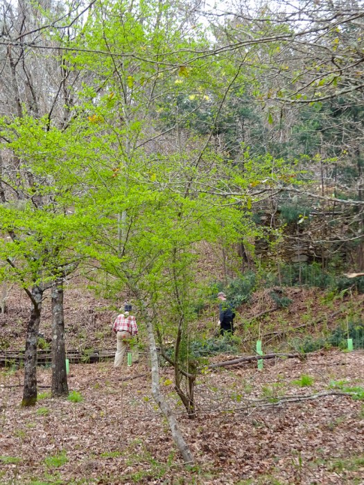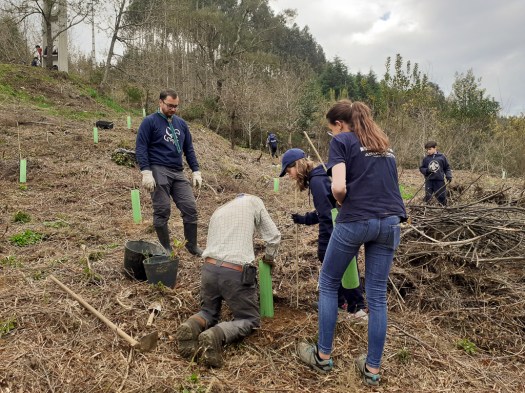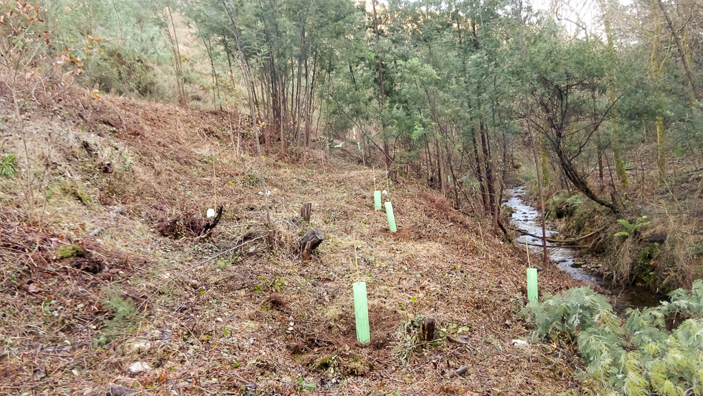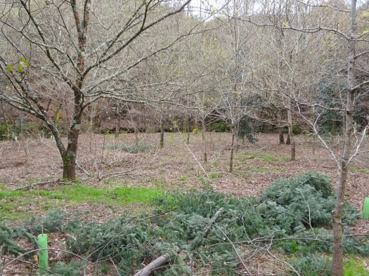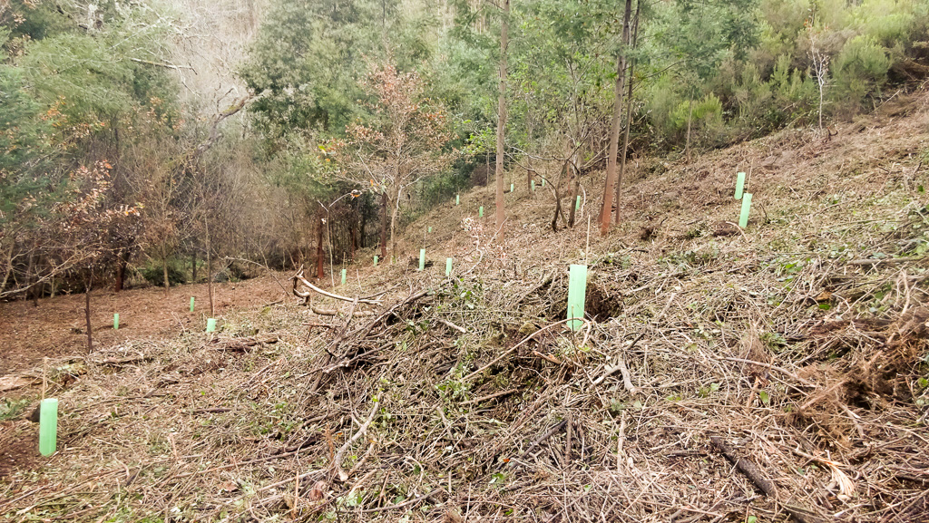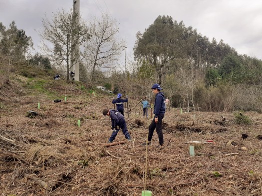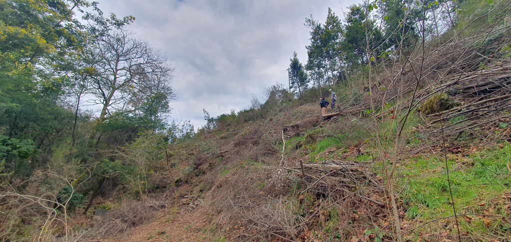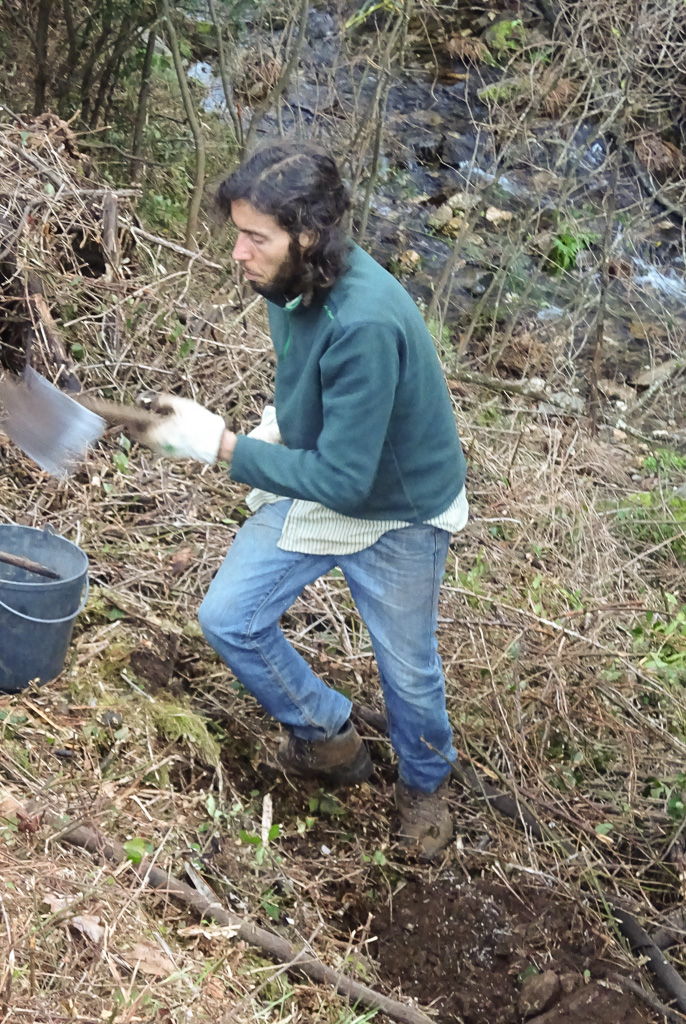 Assim, e depois de uma primeira jornada de Inverno sem voluntários, no dia 18 plantaram-se árvores na Costa e na Chousa (duas zonas contíguas logo a jusante do Feridouro). A Costa é uma zona difícil porque em 2006 foram aí escavados socalcos para plantação de eucaliptos e o solo ficou desestabilizado. A partir de 2015 foram aí plantados os primeiros carvalhos e medronheiros, mas tiveram um desenvolvimento lento. Nas margens do Ribeiro foram necessários anos para desalojar as muitas mimosas que aí estavam bem estabelecidas. Ao longo dos anos foi também crescendo o matagal e o silvado. Com o corte quase total deste último e selectivo do matagal, abriram-se espaços ainda livres para adensamento.
