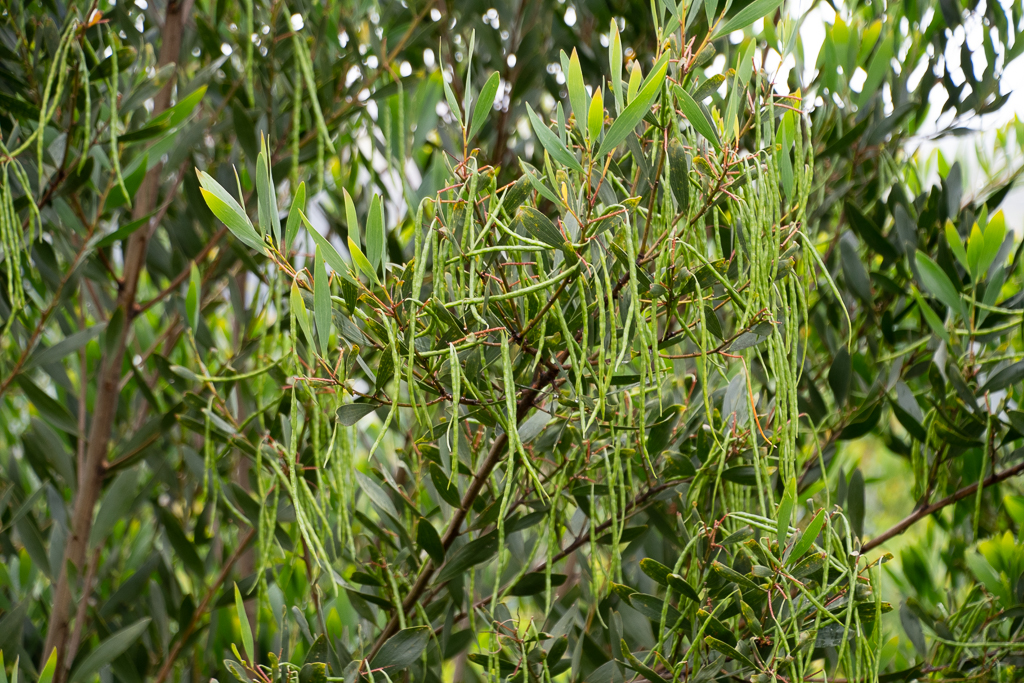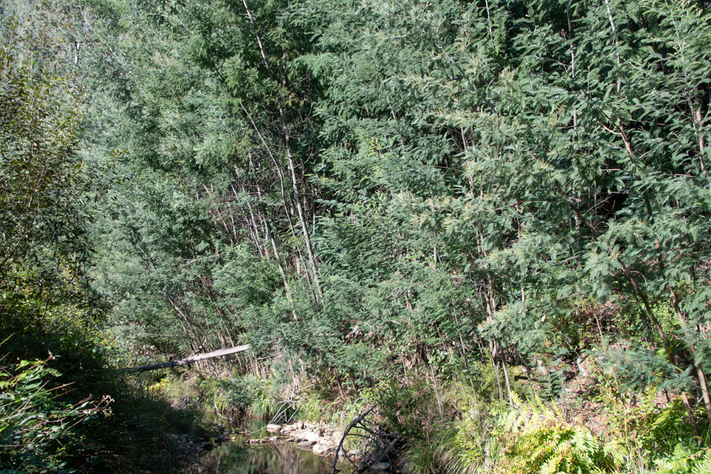 Outra acácia que pode ser localmente problemática, mas que não está muito expandida é a Acacia melanoxylon, acácia-austrália, esta, como a mimosa, uma planta de porte arbóreo, mas que pode gerar formações de grande densidade, difíceis de erradicar.